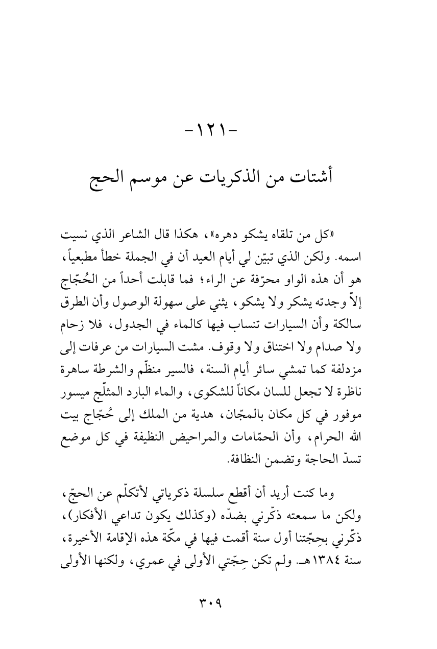 «كل من تلقاه يشكو دهره»، هكذا قال الشاعر الذي نسيت اسمه. ولكن الذي تبيّن لي أيام العيد أن في الجملة خطأ مطبعياً، هو أن هذه الواو محرّفة عن الراء؛ فما قابلت أحداً من الحُجّاج إلاّ وجدته يشكر ولا يشكو، يثني على سهولة الوصول وأن الطرق سالكة وأن السيارات تنساب فيها كالماء في الجدول، فلا زحام ولا صدام ولا اختناق ولا وقوف. مشت السيارات من عرفات إلى مزدلفة كما تمشي سائر أيام السنة، فالسير منظّم والشرطة ساهرة ناظرة لا تجعل للسان مكاناً للشكوى، والماء البارد المثلّج ميسور موفور في كل مكان بالمجّان، هدية من الملك إلى حُجّاج بيت الله الحرام، وأن الحمّامات والمراحيض النظيفة في كل موضع تسدّ الحاجة وتضمن النظافة.