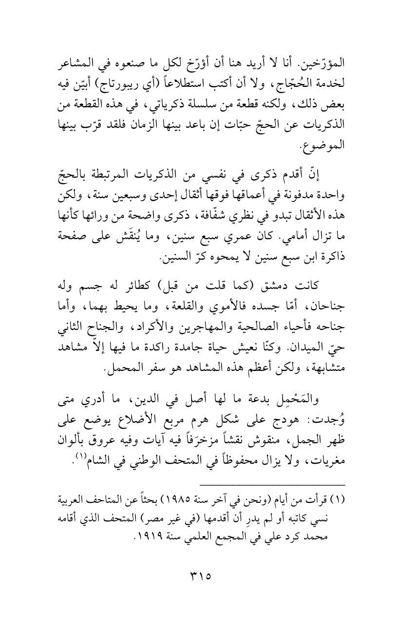 إنّ أقدم ذكرى في نفسي من الذكريات المرتبطة بالحجّ واحدة مدفونة في أعماقها فوقها أثقال إحدى وسبعين سنة، ولكن هذه الأثقال تبدو في نظري شفّافة، ذكرى واضحة من ورائها كأنها ما تزال أمامي. كان عمري سبع سنين، وما يُنقَش على صفحة ذاكرة ابن سبع سنين لا يمحوه كرّ السنين.