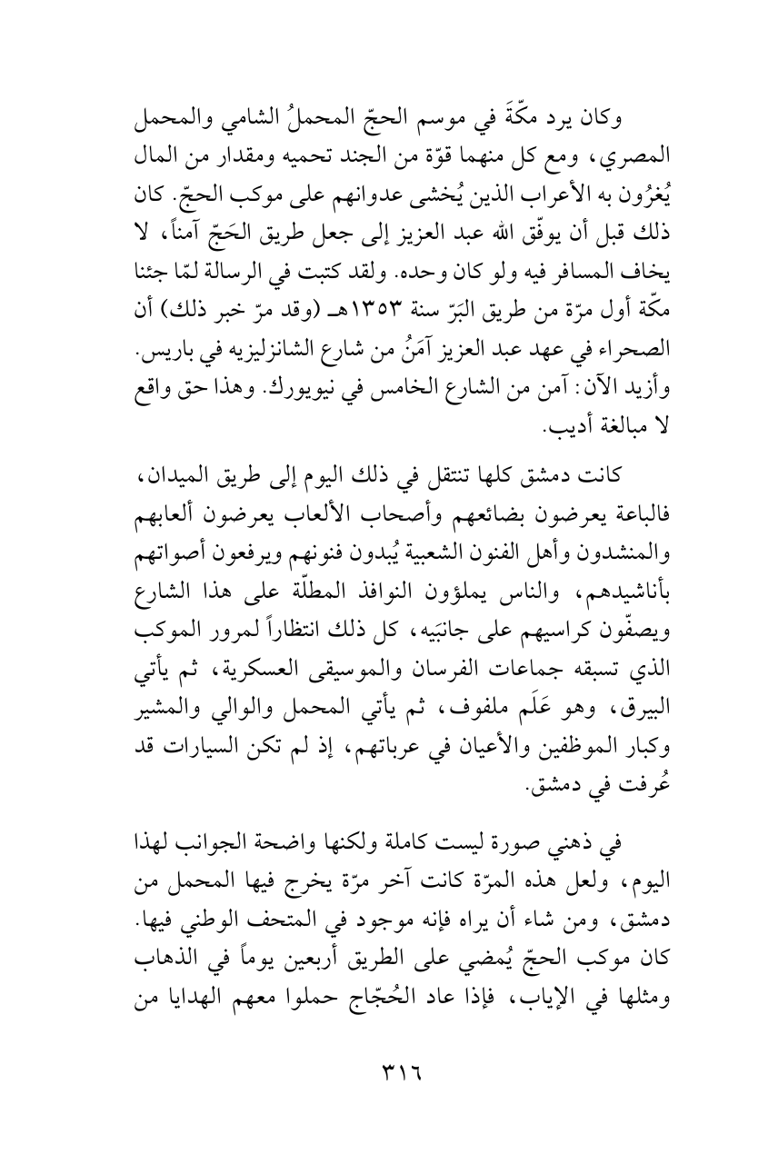 وكان يرد مكّةَ في موسم الحجّ المحملُ الشامي والمحمل المصري، ومع كل منهما قوّة من الجند تحميه ومقدار من المال يُغرُون به الأعراب الذين يُخشى عدوانهم على موكب الحجّ. كان ذلك قبل أن يوفّق الله عبد العزيز إلى جعل طريق الحَجّ آمناً، لا يخاف المسافر فيه ولو كان وحده. ولقد كتبت في الرسالة لمّا جئنا مكّة أول مرّة من طريق البَرّ سنة 1353هـ (وقد مرّ خبر ذلك) أن الصحراء في عهد عبد العزيز آمَنُ من شارع الشانزليزيه في باريس. وأزيد الآن: آمن من الشارع الخامس في نيويورك. وهذا حق واقع لا مبالغة أديب.