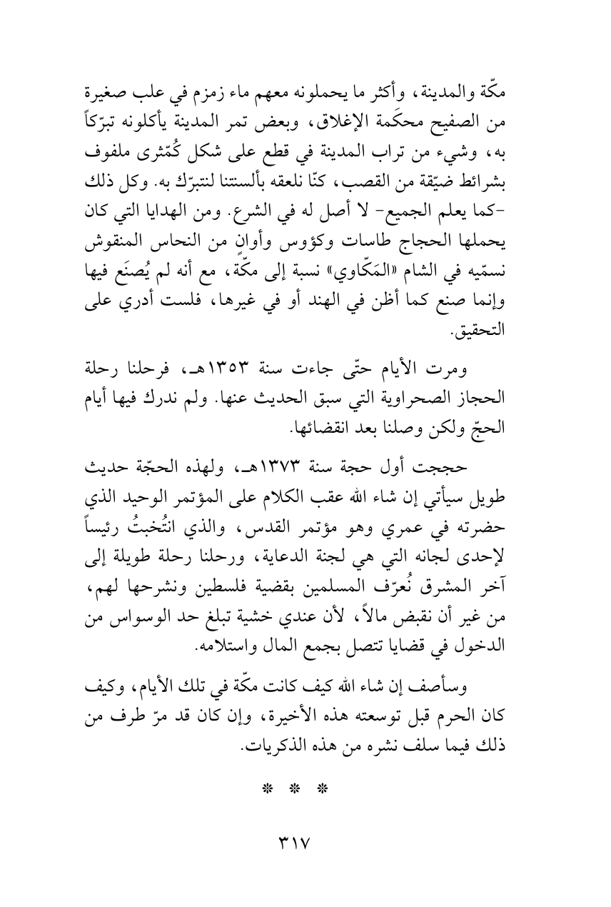 وسأصف إن شاء الله كيف كانت مكّة في تلك الأيام، وكيف كان الحرم قبل توسعته هذه الأخيرة، وإن كان قد مرّ طرف من ذلك فيما سلف نشره من هذه الذكريات.