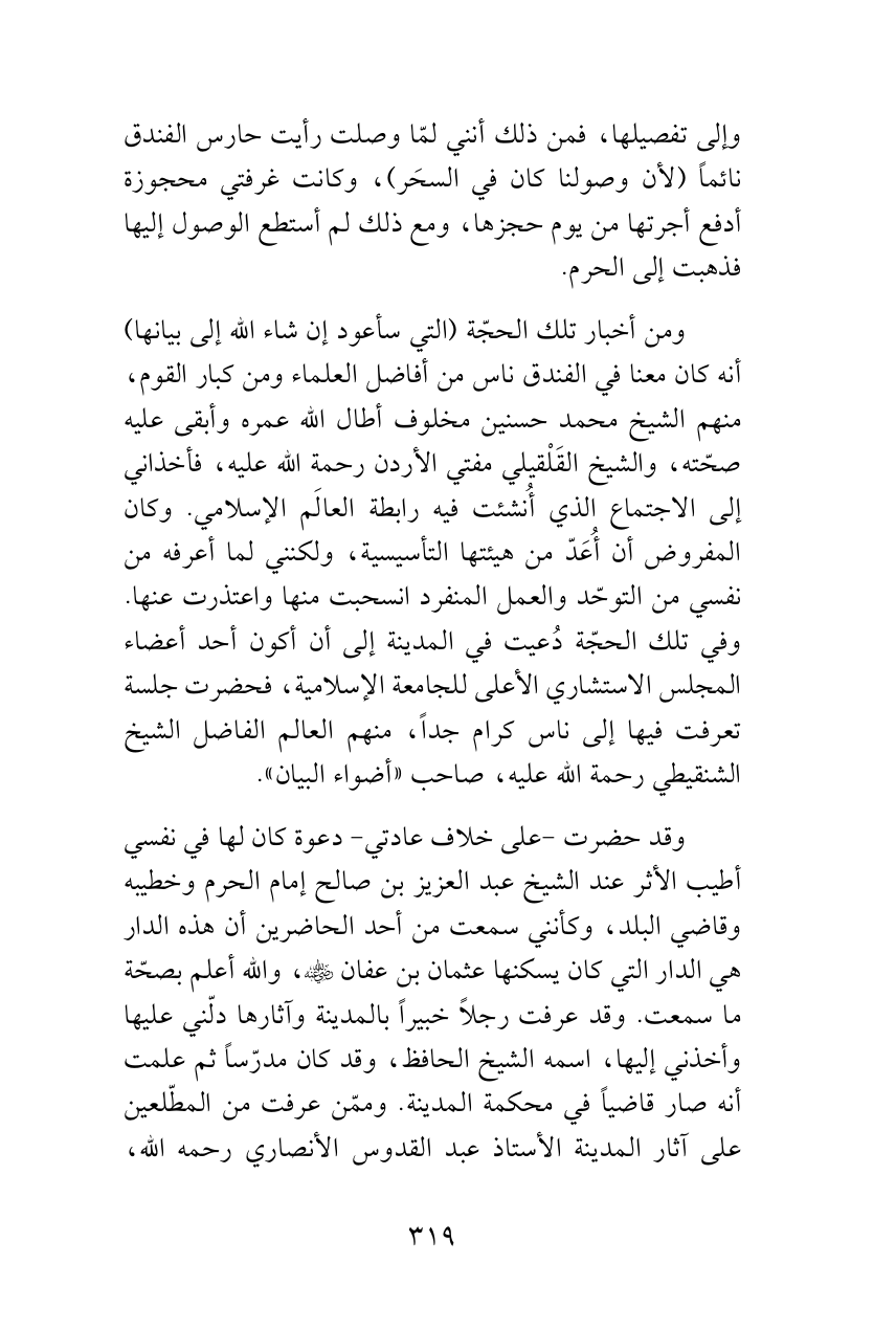 ومن أخبار تلك الحجّة (التي سأعود إن شاء الله إلى بيانها) أنه كان معنا في الفندق ناس من أفاضل العلماء ومن كبار القوم، منهم الشيخ محمد حسنين مخلوف أطال الله عمره وأبقى عليه صحّته، والشيخ القَلْقيلي مفتي الأردن رحمة الله عليه، فأخذاني إلى الاجتماع الذي أُنشئت فيه رابطة العالَم الإسلامي. وكان المفروض أن أُعَدّ من هيئتها التأسيسية، ولكنني لما أعرفه من نفسي من التوحّد والعمل المنفرد انسحبت منها واعتذرت عنها. وفي تلك الحجّة دُعيت في المدينة إلى أن أكون أحد أعضاء المجلس الاستشاري الأعلى للجامعة الإسلامية، فحضرت جلسة تعرفت فيها إلى ناس كرام جداً، منهم العالم الفاضل الشيخ الشنقيطي رحمة الله عليه، صاحب «أضواء البيان».