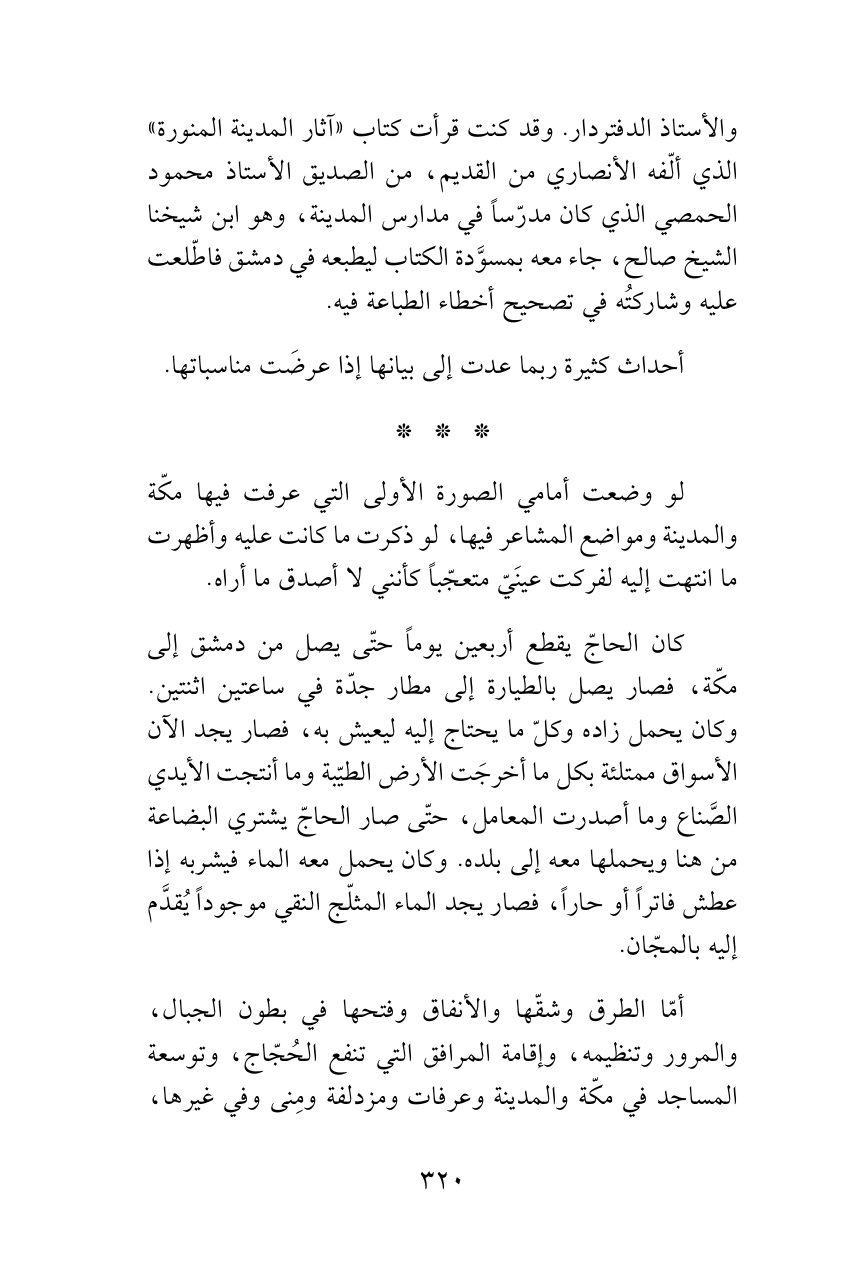 لو وضعت أمامي الصورة الأولى التي عرفت فيها مكّة والمدينة ومواضع المشاعر فيها، لو ذكرت ما كانت عليه وأظهرت ما انتهت إليه لفركت عينَيّ متعجّباً كأنني لا أصدق ما أراه.