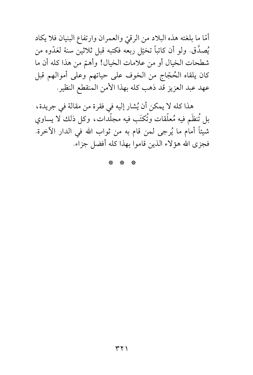أمّا ما بلغته هذه البلاد من الرقيّ والعمران وارتفاع البنيان فلا يكاد يُصدَّق. ولو أن كاتباً تخيّل ربعه فكتبه قبل ثلاثين سنة لعَدّوه من شطحات الخيال أو من علامات الخيال! وأهمّ من هذا كله أن ما كان يلقاه الحُجّاج من الخوف على حياتهم وعلى أموالهم قبل عهد عبد العزيز قد ذهب كله بهذا الأمن المنقطع النظير.