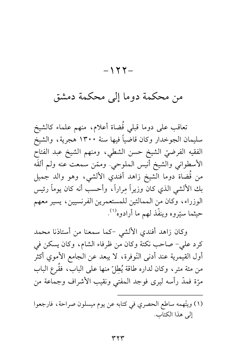تعاقب على دوما قبلي قُضاة أعلام، منهم علماء كالشيخ سليمان الجوخدار وكان قاضياً فيها سنة 1300 هجرية، والشيخ الفقيه الفرضيّ الشيخ حسن الشطي، ومنهم الشيخ عبد الفتاح الأسطواني والشيخ أنيس الملوحي. وممّن سمعت عنه ولم ألقَه من قُضاة دوما الشيخ زاهد أفندي الألشي، وهو والد جميل بك الألشي الذي كان وزيراً مِراراً، وأحسب أنه كان يوماً رئيس الوزراء، وكان من الممالئين للمستعمرين الفرنسيين، يسير معهم حيثما سيّروه وينفّذ لهم ما أرادوه (¬1).