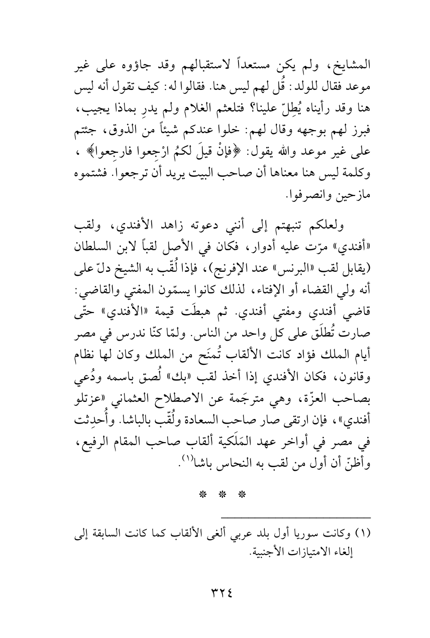 ولعلكم تنبهتم إلى أنني دعوته زاهد الأفندي، ولقب «أفندي» مرّت عليه أدوار، فكان في الأصل لقباً لابن السلطان (يقابل لقب «البرنس» عند الإفرنج)، فإذا لُقّب به الشيخ دلّ على أنه ولي القضاء أو الإفتاء، لذلك كانوا يسمّون المفتي والقاضي: قاضي أفندي ومفتي أفندي. ثم هبطَت قيمة «الأفندي» حتّى صارت تُطلَق على كل واحد من الناس. ولمّا كنّا ندرس في مصر أيام الملك فؤاد كانت الألقاب تُمنَح من الملك وكان لها نظام وقانون، فكان الأفندي إذا أخذ لقب «بك» لُصق باسمه ودُعي بصاحب العزّة، وهي مترجَمة عن الاصطلاح العثماني «عزتلو أفندي»، فإن ارتقى صار صاحب السعادة ولُقّب بالباشا. وأُحدِثت في مصر في أواخر عهد المَلَكية ألقاب صاحب المقام الرفيع، وأظنّ أن أول من لقب به النحاس باشا (¬1).