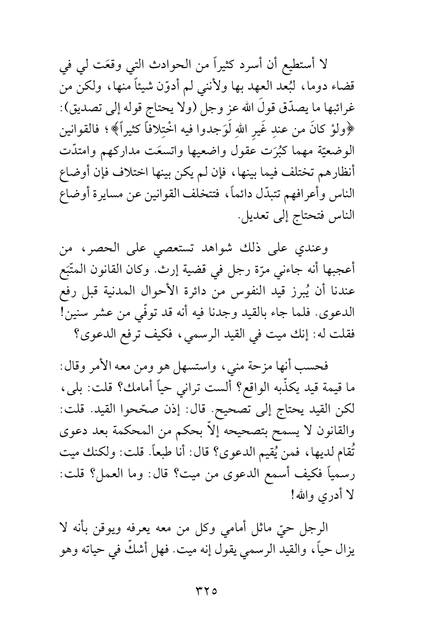 فحسب أنها مزحة مني، واستسهل هو ومن معه الأمر وقال: ما قيمة قيد يكذّبه الواقع؟ ألست تراني حياً أمامك؟ قلت: بلى، لكن القيد يحتاج إلى تصحيح. قال: إذن صحّحوا القيد. قلت: والقانون لا يسمح بتصحيحه إلاّ بحكم من المحكمة بعد دعوى تُقام لديها، فمن يُقيم الدعوى؟ قال: أنا طبعاً. قلت: ولكنك ميت رسمياً فكيف أسمع الدعوى من ميت؟ قال: وما العمل؟ قلت: لا أدري والله!