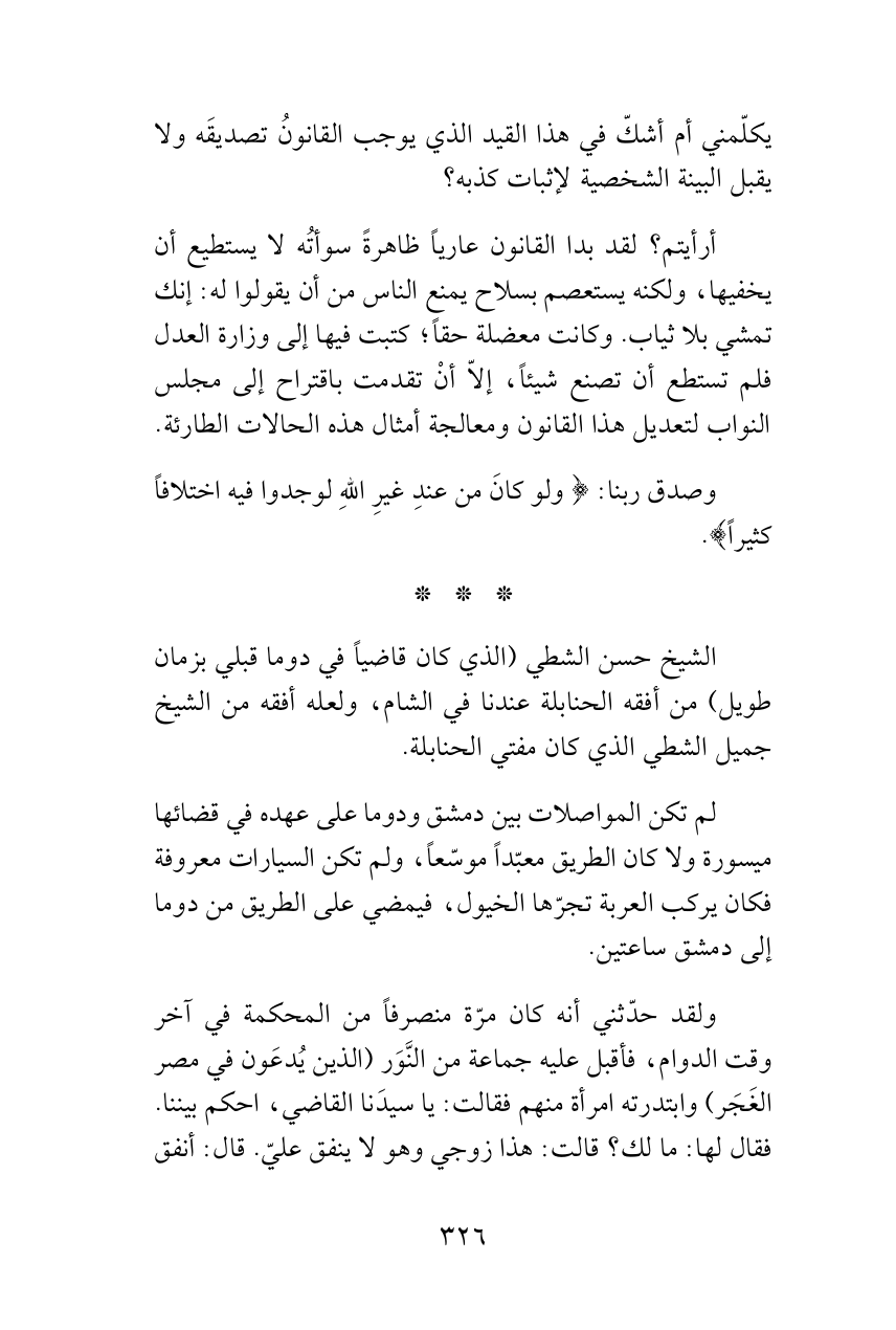 أرأيتم؟ لقد بدا القانون عارياً ظاهرةً سوأتُه لا يستطيع أن يخفيها، ولكنه يستعصم بسلاح يمنع الناس من أن يقولوا له: إنك تمشي بلا ثياب. وكانت معضلة حقاً؛ كتبت فيها إلى وزارة العدل فلم تستطع أن تصنع شيئاً، إلاّ أنْ تقدمت باقتراح إلى مجلس النواب لتعديل هذا القانون ومعالجة أمثال هذه الحالات الطارئة.