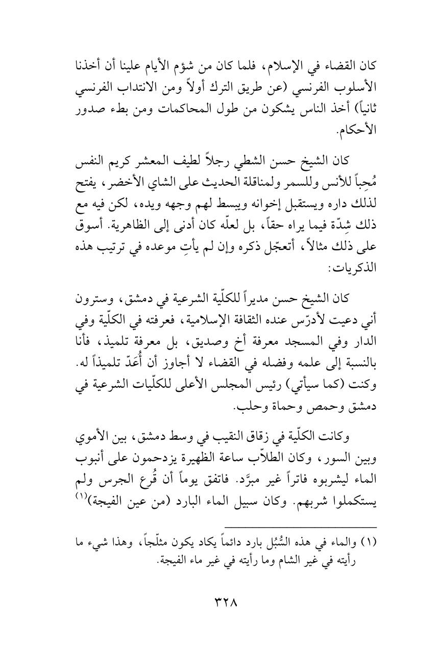 كان القضاء في الإسلام، فلما كان من شؤم الأيام علينا أن أخذنا الأسلوب الفرنسي (عن طريق الترك أولاً ومن الانتداب الفرنسي ثانياً) أخذ الناس يشكون من طول المحاكمات ومن بطء صدور الأحكام.