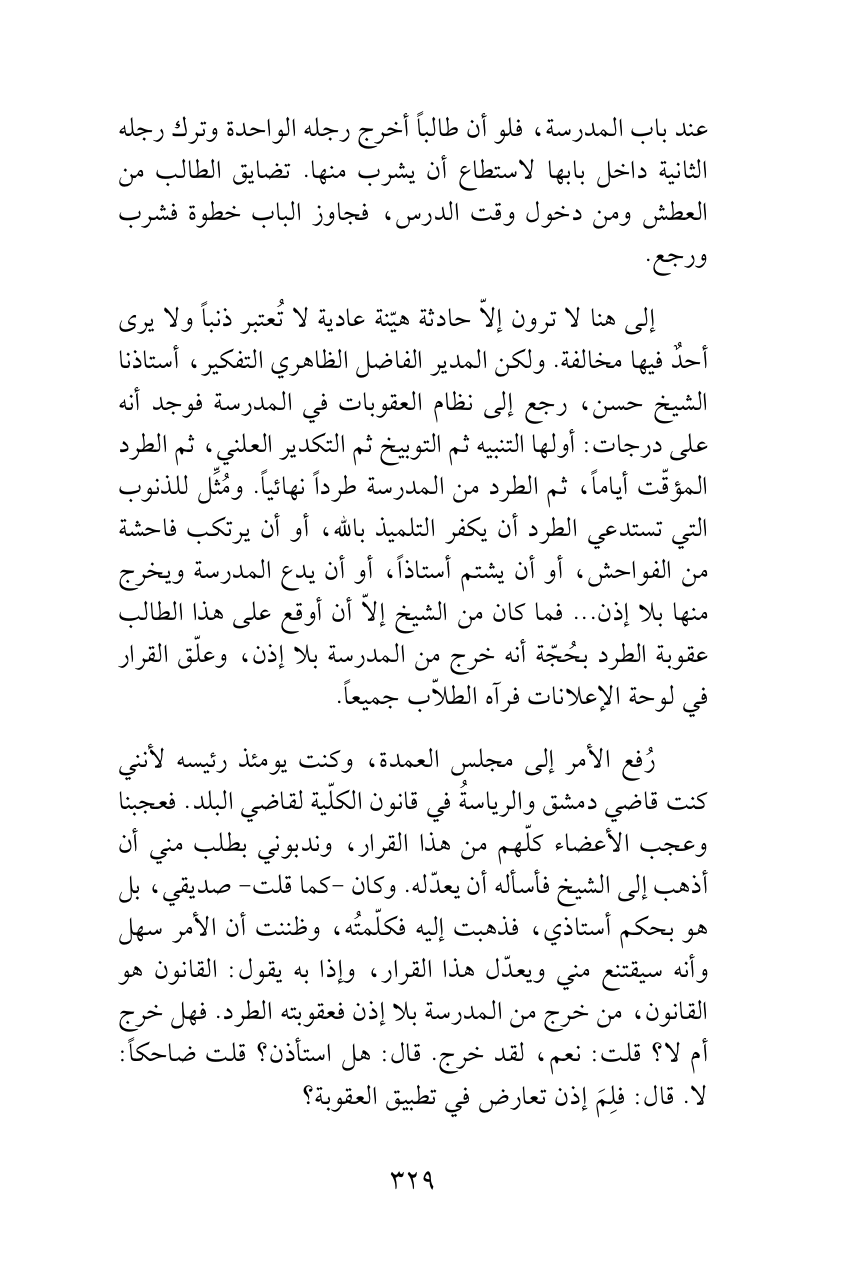 إلى هنا لا ترون إلاّ حادثة هيّنة عادية لا تُعتبر ذنباً ولا يرى أحدٌ فيها مخالفة. ولكن المدير الفاضل الظاهري التفكير، أستاذنا الشيخ حسن، رجع إلى نظام العقوبات في المدرسة فوجد أنه على درجات: أولها التنبيه ثم التوبيخ ثم التكدير العلني، ثم الطرد المؤقّت أياماً، ثم الطرد من المدرسة طرداً نهائياً. ومُثِّل للذنوب التي تستدعي الطرد أن يكفر التلميذ بالله، أو أن يرتكب فاحشة من الفواحش، أو أن يشتم أستاذاً، أو أن يدع المدرسة ويخرج منها بلا إذن ... فما كان من الشيخ إلاّ أن أوقع على هذا الطالب عقوبة الطرد بحُجّة أنه خرج من المدرسة بلا إذن، وعلّق القرار في لوحة الإعلانات فرآه الطلاّب جميعاً.