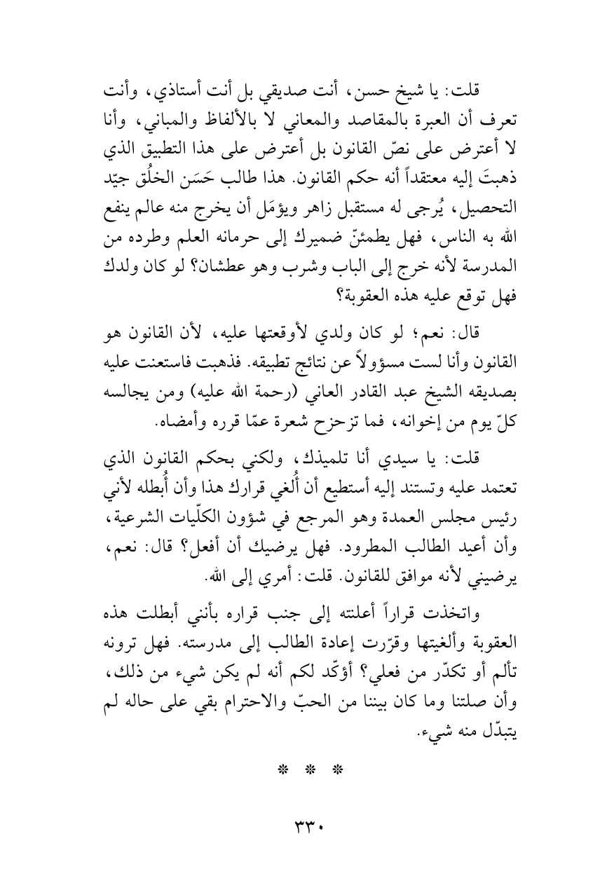 قلت: يا شيخ حسن، أنت صديقي بل أنت أستاذي، وأنت تعرف أن العبرة بالمقاصد والمعاني لا بالألفاظ والمباني، وأنا لا أعترض على نصّ القانون بل أعترض على هذا التطبيق الذي ذهبتَ إليه معتقداً أنه حكم القانون. هذا طالب حَسَن الخلُق جيّد التحصيل، يُرجى له مستقبل زاهر ويؤمَل أن يخرج منه عالم ينفع الله به الناس، فهل يطمئنّ ضميرك إلى حرمانه العلم وطرده من المدرسة لأنه خرج إلى الباب وشرب وهو عطشان؟ لو كان ولدك فهل توقع عليه هذه العقوبة؟