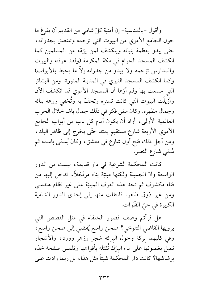 وأقول -بالمناسبة- إن أمنية كلّ شامي من القديم أن يفرغ ما حول الجامع الأموي من البيوت التي تزحمه وتلتصق بجدرانه، حتّى يبدو بعظمة بنيانه وينكشف لمن يؤمّه من المسلمين كما انكشف المسجد الحرام في مكة المكرمة (ولقد عرفته والبيوت والمدارس تزحمه ولا يبدو من جدرانه إلاّ ما يحيط بالأبواب) وكما انكشف المسجد النبوي في المدينة المنورة. ومن البشائر التي سمعت بها ولم أرَها أن المسجد الأموي قد انكشف الآن وأزيلَت البيوت التي كانت تستره وتحفّ به وتُخفي روعة بنائه وجمال مظهره. وكان ممّن فكر في ذلك جمال باشا خلال الحرب العالمية الأولى، أراد أن يكون أمام كل باب من أبواب الجامع الأموي الأربعة شارع مستقيم يمتد حتّى يخرج إلى ظاهر البلد، ومن أجل ذلك فتح أول شارع في دمشق، وكان يُسمّى باسمه ثم سُمّي شارع النصر.