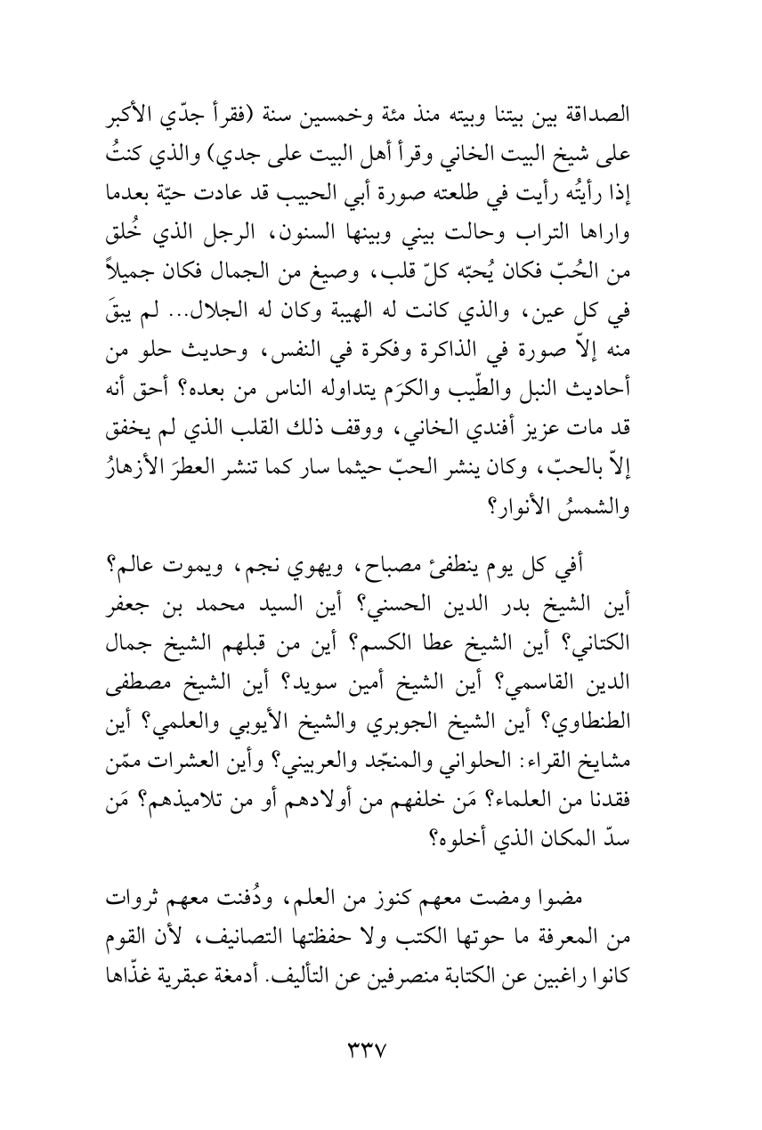 أفي كل يوم ينطفئ مصباح، ويهوي نجم، ويموت عالم؟ أين الشيخ بدر الدين الحسني؟ أين السيد محمد بن جعفر الكتاني؟ أين الشيخ عطا الكسم؟ أين من قبلهم الشيخ جمال الدين القاسمي؟ أين الشيخ أمين سويد؟ أين الشيخ مصطفى الطنطاوي؟ أين الشيخ الجوبري والشيخ الأيوبي والعلمي؟ أين مشايخ القراء: الحلواني والمنجّد والعربيني؟ وأين العشرات ممّن فقدنا من العلماء؟ مَن خلفهم من أولادهم أو من تلاميذهم؟ مَن سدّ المكان الذي أخلوه؟