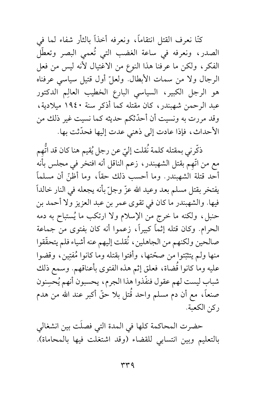 ذكّرني بمقتله كلمة نُقلت إليّ عن رجل يُقيم هنا كان قد اتُّهِم مع من اتّهِم بقتل الشهبندر، زعم الناقل أنه افتخر في مجلس بأنه أحد قتلة الشهبندر. وما أحسب ذلك حقاً، وما أظنّ أن مسلماً يفتخر بقتل مسلم بعد وعيد الله عزّ وجلّ بأنه يجعله في النار خالداً فيها. والشهبندر ما كان في تقوى عمر بن عبد العزيز ولا أحمد بن حنبل، ولكنه ما خرج من الإسلام ولا ارتكب ما يُستباح به دمه الحرام. وكان قتله إثماً كبيراً، زعموا أنه كان بفتوى من جماعة صالحين ولكنهم من الجاهلين، نُقلت إليهم عنه أشياء فلم يتحقّقوا منها ولم يتثبّتوا من صحّتها، وأفتوا بقتله وما كانوا مُفتِين، وقضوا عليه وما كانوا قُضاة، فعلق إثم هذه الفتوى بأعناقهم. وسمع ذلك شباب ليست لهم عقول فنفّذوا هذا الجرم، يحسبون أنهم يُحسِنون صنعاً، مع أن دم مسلم واحد قُتل بلا حقّ أكبر عند الله من هدم ركن الكعبة.