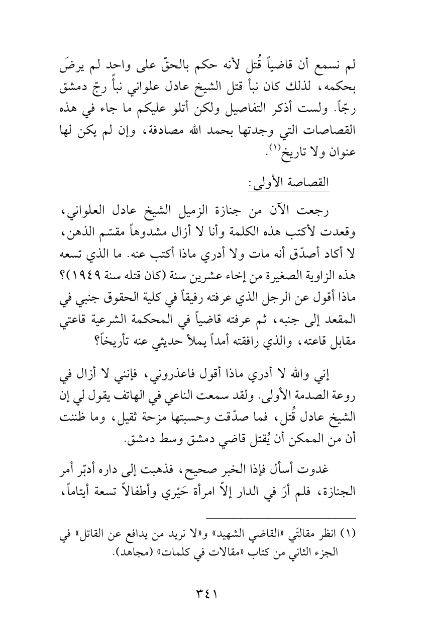 رجعت الآن من جنازة الزميل الشيخ عادل العلواني، وقعدت لأكتب هذه الكلمة وأنا لا أزال مشدوهاً مقسّم الذهن، لا أكاد أصدّق أنه مات ولا أدري ماذا أكتب عنه. ما الذي تسعه هذه الزاوية الصغيرة من إخاء عشرين سنة (كان قتله سنة 1949)؟ ماذا أقول عن الرجل الذي عرفته رفيقاً في كلية الحقوق جنبي في المقعد إلى جنبه، ثم عرفته قاضياً في المحكمة الشرعية قاعتي مقابل قاعته، والذي رافقته أمداً يملأ حديثي عنه تأريخاً؟
