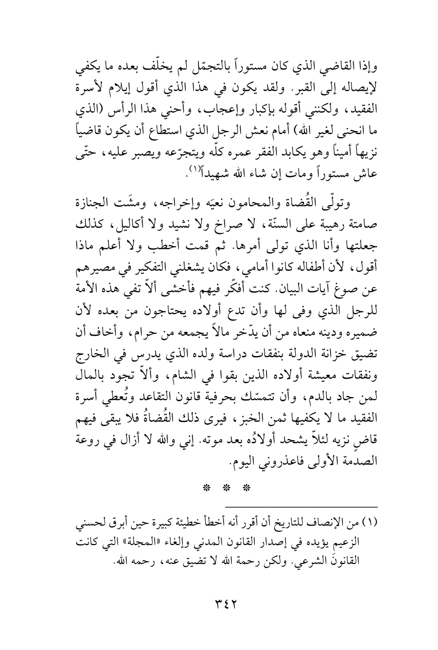 وإذا القاضي الذي كان مستوراً بالتجمّل لم يخلّف بعده ما يكفي لإيصاله إلى القبر. ولقد يكون في هذا الذي أقول إيلام لأسرة الفقيد، ولكنني أقوله بإكبار وإعجاب، وأحني هذا الرأس (الذي ما انحنى لغير الله) أمام نعش الرجل الذي استطاع أن يكون قاضياً نزيهاً أميناً وهو يكابد الفقر عمره كلّه ويتجرّعه ويصبر عليه، حتّى عاش مستوراً ومات إن شاء الله شهيداً (¬1).