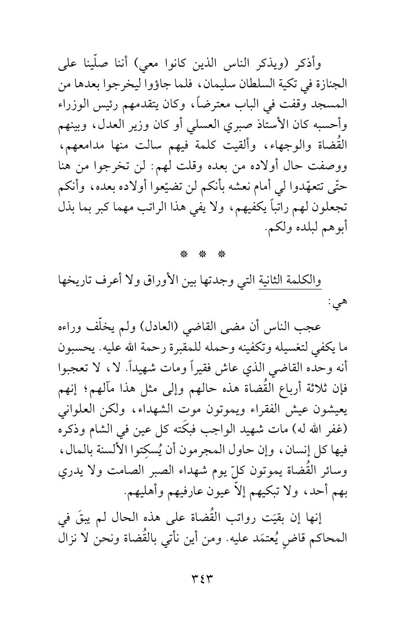 عجب الناس أن مضى القاضي (العادل) ولم يخلّف وراءه ما يكفي لتغسيله وتكفينه وحمله للمقبرة رحمة الله عليه. يحسبون أنه وحده القاضي الذي عاش فقيراً ومات شهيداً. لا، لا تعجبوا فإن ثلاثة أرباع القُضاة هذه حالهم وإلى مثل هذا مآلهم؛ إنهم يعيشون عيش الفقراء ويموتون موت الشهداء، ولكن العلواني (غفر الله له) مات شهيد الواجب فبكَته كل عين في الشام وذكره فيها كل إنسان، وإن حاول المجرمون أن يُسكِتوا الألسنة بالمال، وسائر القُضاة يموتون كلّ يوم شهداء الصبر الصامت ولا يدري بهم أحد، ولا تبكيهم إلاّ عيون عارفيهم وأهليهم.
