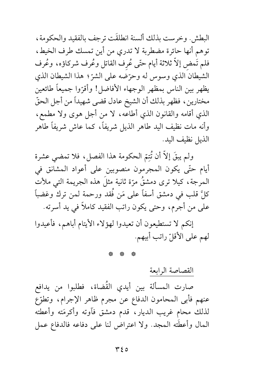 ولم يبقَ إلاّ أن تُتِمّ الحكومة هذا الفصل، فلا تمضي عشرة أيام حتّى يكون المجرمون منصوبين على أعواد المشانق في المرجة، كيلا ترى دمشقُ مرّة ثانية مثلَ هذه الجريمة التي ملأت كلَّ قلب في دمشق أسفاً على مَن فُقد ورحمة لمن ترك وغضباً على من أجرم، وحتى يكون راتب الفقيد كاملاً في يد أسرته.
