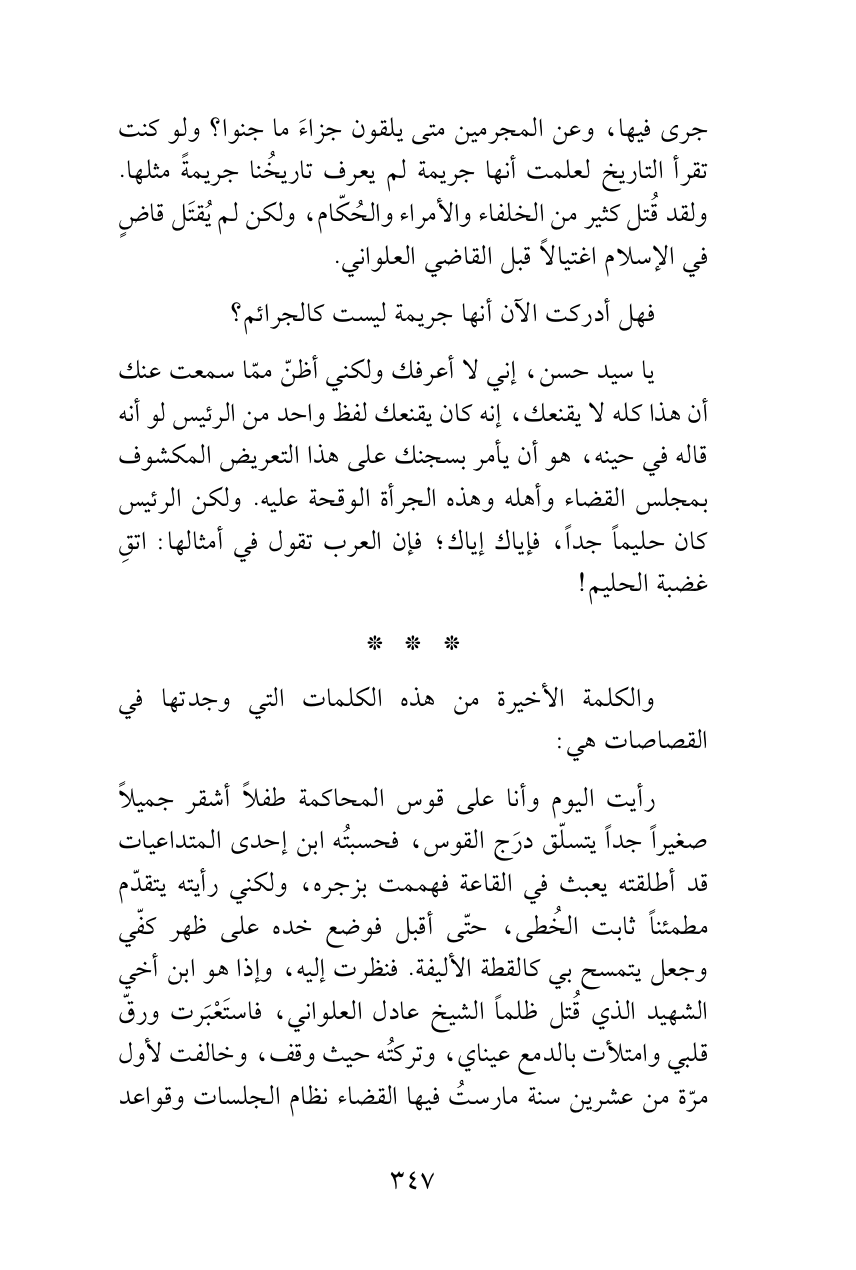 جرى فيها، وعن المجرمين متى يلقون جزاءَ ما جنوا؟ ولو كنت تقرأ التاريخ لعلمت أنها جريمة لم يعرف تاريخُنا جريمةً مثلها. ولقد قُتل كثير من الخلفاء والأمراء والحُكّام، ولكن لم يُقتَل قاضٍ في الإسلام اغتيالاً قبل القاضي العلواني.