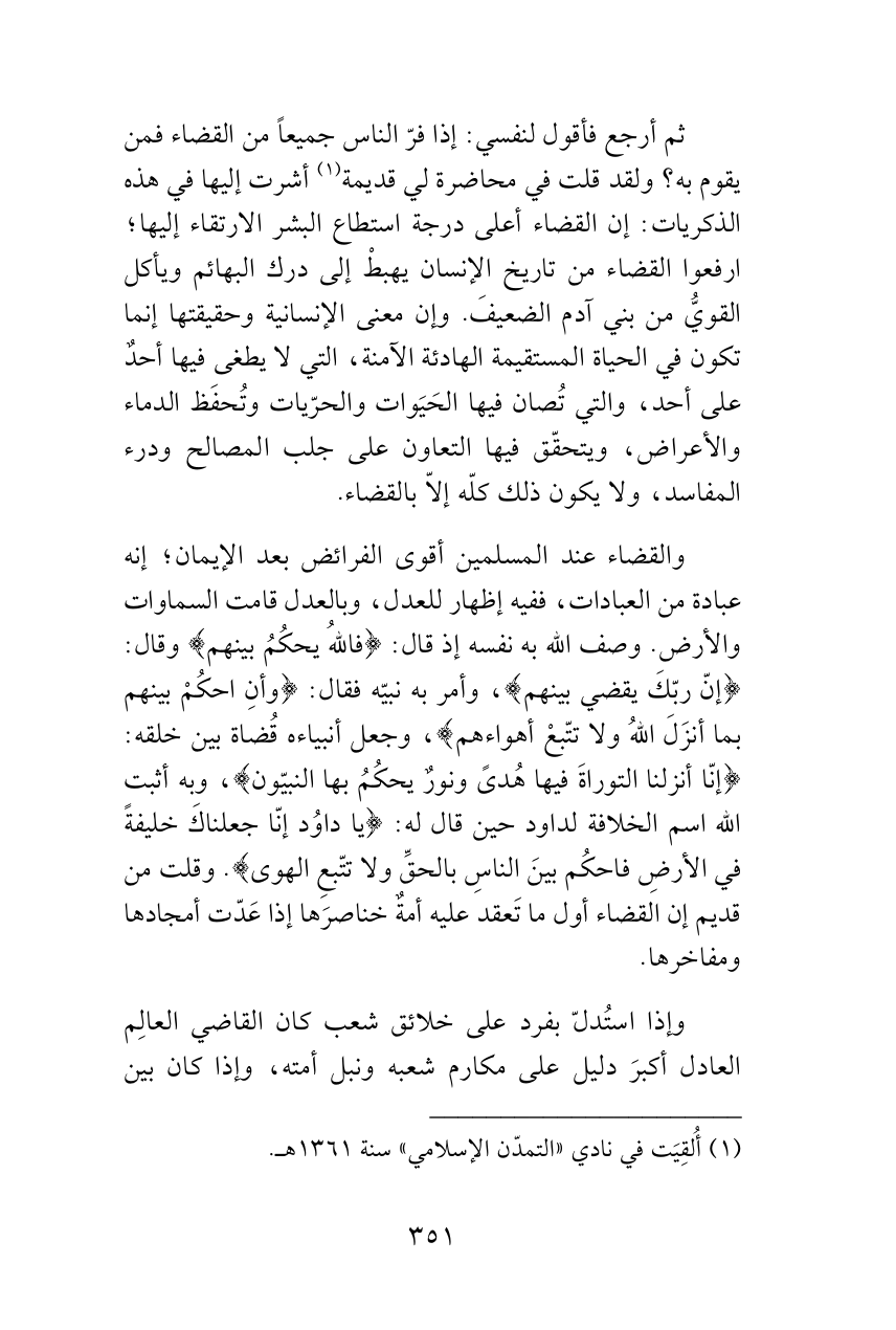 ثم أرجع فأقول لنفسي: إذا فرّ الناس جميعاً من القضاء فمن يقوم به؟ ولقد قلت في محاضرة لي قديمة (¬1) أشرت إليها في هذه الذكريات: إن القضاء أعلى درجة استطاع البشر الارتقاء إليها؛ ارفعوا القضاء من تاريخ الإنسان يهبطْ إلى درك البهائم ويأكل القويُّ من بني آدم الضعيفَ. وإن معنى الإنسانية وحقيقتها إنما تكون في الحياة المستقيمة الهادئة الآمنة، التي لا يطغى فيها أحدٌ على أحد، والتي تُصان فيها الحَيَوات والحرّيات وتُحفَظ الدماء والأعراض، ويتحقّق فيها التعاون على جلب المصالح ودرء المفاسد، ولا يكون ذلك كلّه إلاّ بالقضاء.
