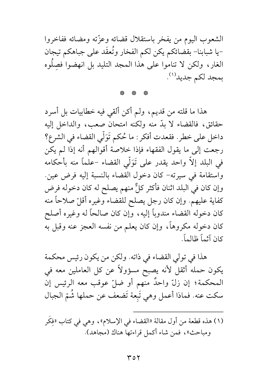 (¬1) هذه قطعة من أول مقالة «القضاء في الإسلام»، وهي في كتاب «فِكَر ومباحث»، فمن شاء أكمل قراءتها هناك (مجاهد).