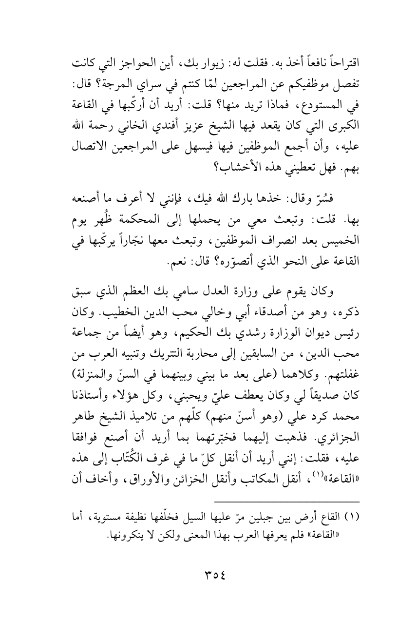 اقتراحاً نافعاً أخذ به. فقلت له: زيوار بك، أين الحواجز التي كانت تفصل موظفيكم عن المراجعين لمّا كنتم في سراي المرجة؟ قال: في المستودع، فماذا تريد منها؟ قلت: أريد أن أركّبها في القاعة الكبرى التي كان يقعد فيها الشيخ عزيز أفندي الخاني رحمة الله عليه، وأن أجمع الموظفين فيها فيسهل على المراجعين الاتصال بهم. فهل تعطيني هذه الأخشاب؟