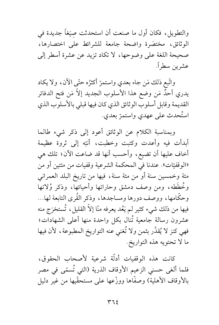 وبمناسبة الكلام عن الوثائق أعود إلى ذكر شيء طالما أبدأت فيه وأعدت وكتبت وخطبت، أنبّه إلى ثروة عظيمة أخاف عليها أن تضيع، وأحسب أنها قد ضاعت الآن؛ تلك هي «الوقفيّات». عندنا في المحكمة الشرعية وقفيات من مئتين أو من مئة وخمسين سنة أو من مئة سنة، فيها من تاريخ البلد العمراني وخُطَطه، ومن وصف دمشق وحاراتها وأحيائها، وذكر وُلاتها وحكّامها، ووصف دورها ومساجدها، وذكر القُرى التابعة لها ... فيها من ذلك شيء كثير لم يَعُد يعرفه منّا إلاّ القليل، تُستخرَج منه عشرون رسالة جامعية تُنال بكل واحدة منها أعلى الشهادات؛ فهي كنز لا يُقدَّر بثمن ولا تُغني عنه التواريخ المطبوعة، لأن فيها ما لا تحتويه هذه التواريخ.