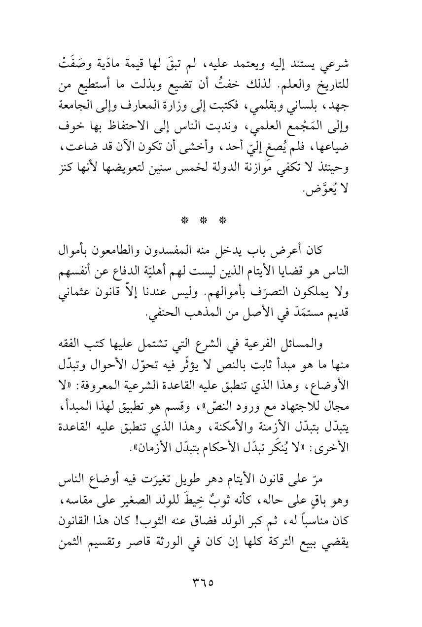 مرّ على قانون الأيتام دهر طويل تغيرَت فيه أوضاع الناس وهو باقٍ على حاله، كأنه ثوبٌ خِيطَ للولد الصغير على مقاسه، كان مناسباً له، ثم كبر الولد فضاق عنه الثوب! كان هذا القانون يقضي ببيع التركة كلها إن كان في الورثة قاصر وتقسيم الثمن