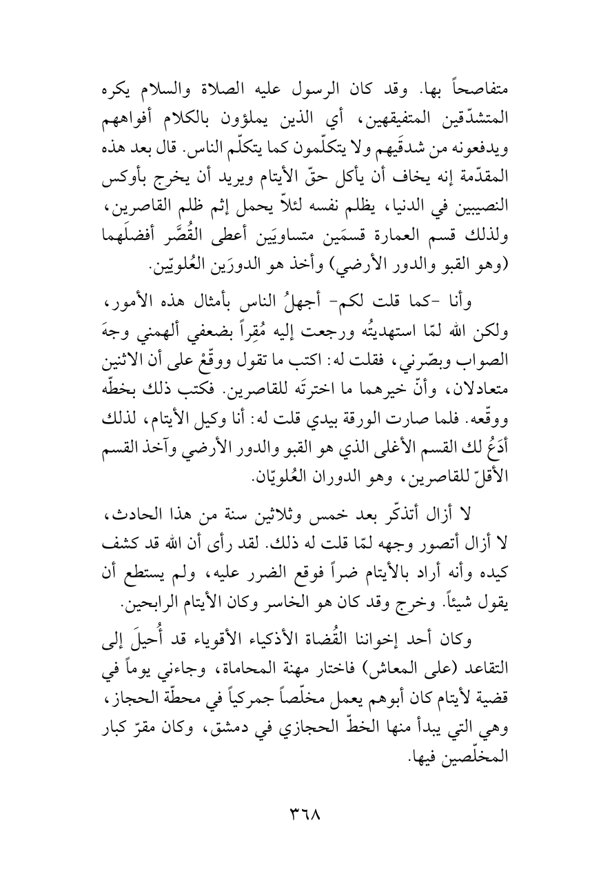متفاصحاً بها. وقد كان الرسول عليه الصلاة والسلام يكره المتشدّقين المتفيقهين، أي الذين يملؤون بالكلام أفواههم ويدفعونه من شدقَيهم ولا يتكلّمون كما يتكلّم الناس. قال بعد هذه المقدّمة إنه يخاف أن يأكل حقّ الأيتام ويريد أن يخرج بأوكس النصيبين في الدنيا، يظلم نفسه لئلاّ يحمل إثم ظلم القاصرين، ولذلك قسم العمارة قسمَين متساويَين أعطى القُصَّر أفضلَهما (وهو القبو والدور الأرضي) وأخذ هو الدورَين العُلويّين.