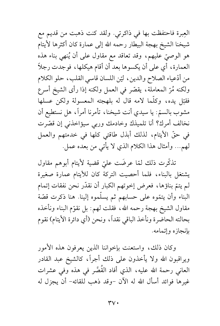 العِبرة فاحتفظت بها في ذاكرتي. ولقد كنت ذهبت من قديم مع شيخنا الشيخ بهجة البيطار رحمه الله إلى عمارة كان أكثرها لأيتام هو الوصيّ عليهم، وقد تعاقد مع مقاول على أن يُنهي بناء هذه العمارة، أي على أن يكسوها بعد أن أقام هيكلها، فوجدت رجلاً من أدْعياء الصلاح والدين، ليّن اللسان قاسي القلب، حلو الكلام ولكنه مُرّ المعاملة، يقصّر في العمل ولكنه إذا رأى الشيخ أسرع فقبّل يده، وكلّما لامه قال له بلهجته المعسولة ولكن عسلها مشوب بالسمّ: يا سيدي أنت شيخنا، تأمرنا أمراً، هل نستطيع أن نخالف أمرك؟ أنا تلميذك وخادمك وربي سيؤاخذني إن قصّرت في حقّ الأيتام، لذلك أبذل طاقتي كلها في خدمتهم والعمل لهم ... وأمثال هذا الكلام الذي لا يأتي من بعده عمل.