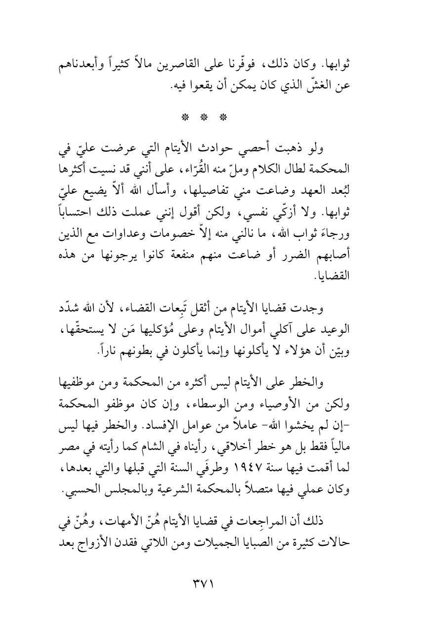 والخطر على الأيتام ليس أكثره من المحكمة ومن موظفيها ولكن من الأوصياء ومن الوسطاء، وإن كان موظفو المحكمة -إن لم يخشوا الله- عاملاً من عوامل الإفساد. والخطر فيها ليس مالياً فقط بل هو خطر أخلاقي، رأيناه في الشام كما رأيته في مصر لما أقمت فيها سنة 1947 وطرفَي السنة التي قبلها والتي بعدها، وكان عملي فيها متصلاً بالمحكمة الشرعية وبالمجلس الحسبي.