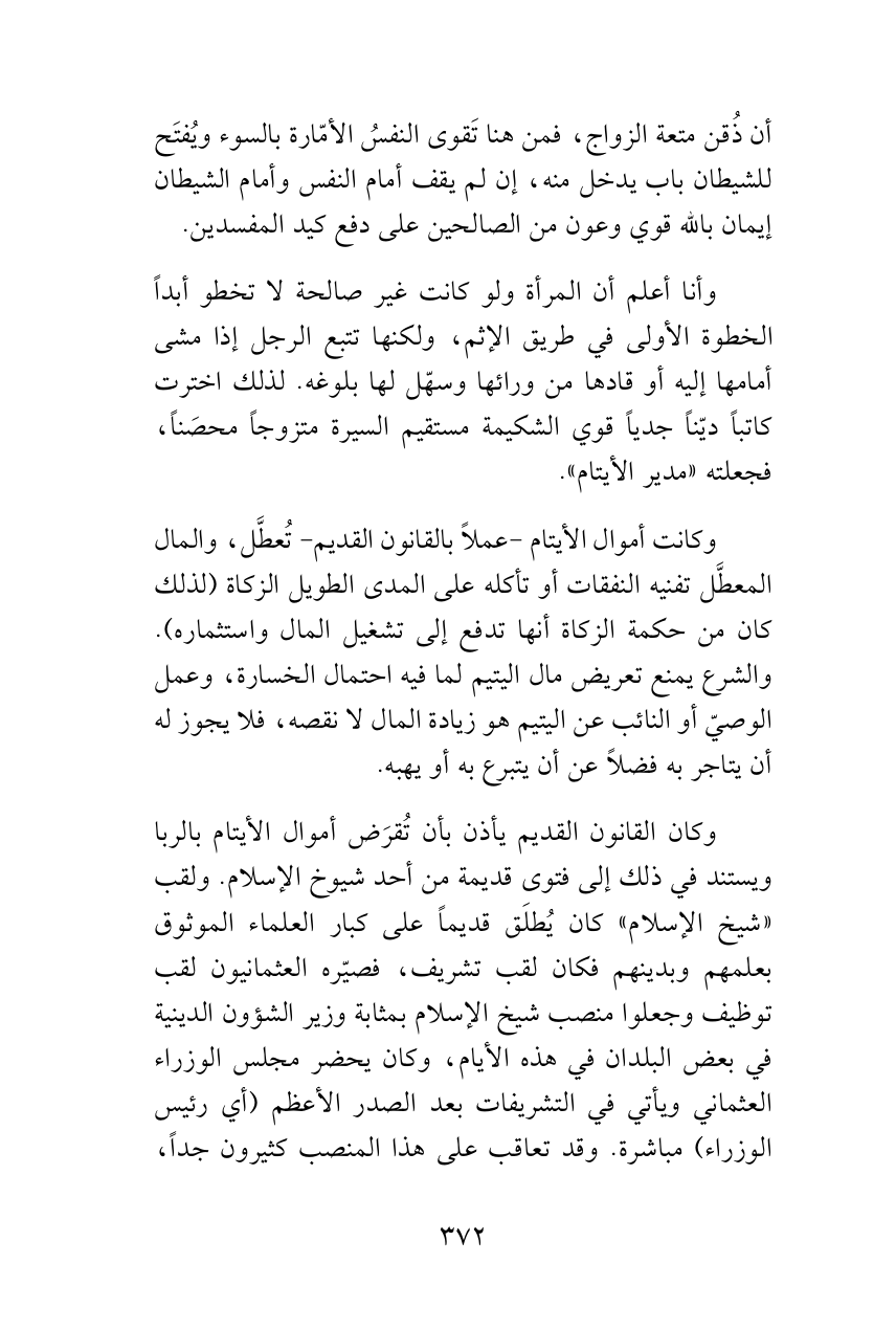 وكان القانون القديم يأذن بأن تُقرَض أموال الأيتام بالربا ويستند في ذلك إلى فتوى قديمة من أحد شيوخ الإسلام. ولقب «شيخ الإسلام» كان يُطلَق قديماً على كبار العلماء الموثوق بعلمهم وبدينهم فكان لقب تشريف، فصيّره العثمانيون لقب توظيف وجعلوا منصب شيخ الإسلام بمثابة وزير الشؤون الدينية في بعض البلدان في هذه الأيام، وكان يحضر مجلس الوزراء العثماني ويأتي في التشريفات بعد الصدر الأعظم (أي رئيس الوزراء) مباشرة. وقد تعاقب على هذا المنصب كثيرون جداً،