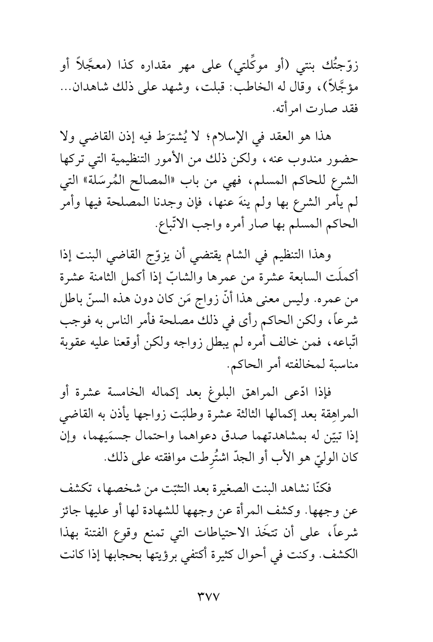 وهذا التنظيم في الشام يقتضي أن يزوّج القاضي البنت إذا أكملَت السابعة عشرة من عمرها والشابّ إذا أكمل الثامنة عشرة من عمره. وليس معنى هذا أنّ زواج مَن كان دون هذه السنّ باطل شرعاً، ولكن الحاكم رأى في ذلك مصلحة فأمر الناس به فوجب اتّباعه، فمن خالف أمره لم يبطل زواجه ولكن أوقعنا عليه عقوبة مناسبة لمخالفته أمر الحاكم.