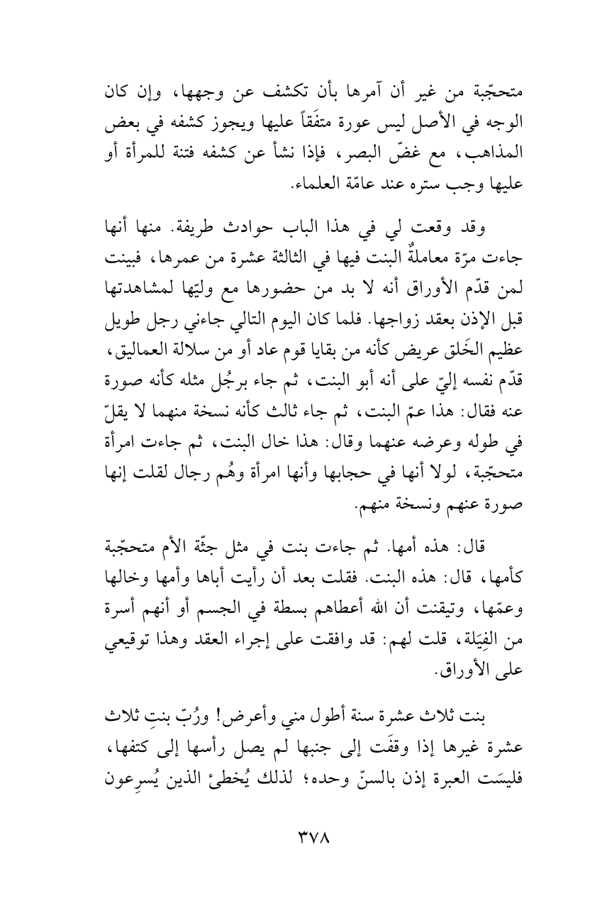 وقد وقعت لي في هذا الباب حوادث طريفة. منها أنها جاءت مرّة معاملةٌ البنت فيها في الثالثة عشرة من عمرها، فبينت لمن قدّم الأوراق أنه لا بد من حضورها مع وليّها لمشاهدتها قبل الإذن بعقد زواجها. فلما كان اليوم التالي جاءني رجل طويل عظيم الخَلق عريض كأنه من بقايا قوم عاد أو من سلالة العماليق، قدّم نفسه إليّ على أنه أبو البنت، ثم جاء برجُل مثله كأنه صورة عنه فقال: هذا عمّ البنت، ثم جاء ثالث كأنه نسخة منهما لا يقلّ في طوله وعرضه عنهما وقال: هذا خال البنت، ثم جاءت امرأة متحجّبة، لولا أنها في حجابها وأنها امرأة وهُم رجال لقلت إنها صورة عنهم ونسخة منهم.
