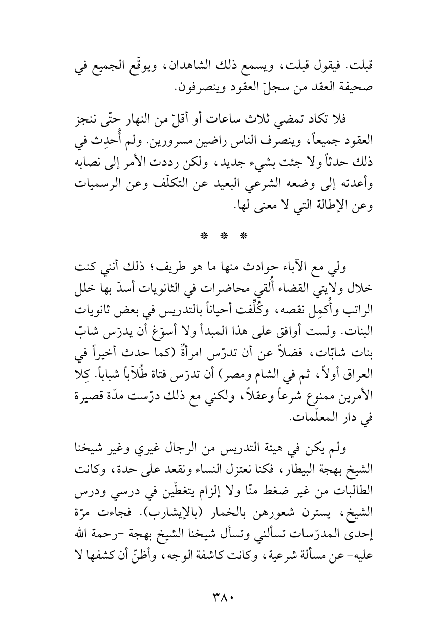 ولم يكن في هيئة التدريس من الرجال غيري وغير شيخنا الشيخ بهجة البيطار، فكنا نعتزل النساء ونقعد على حدة، وكانت الطالبات من غير ضغط منّا ولا إلزام يتغطّين في درسي ودرس الشيخ، يسترن شعورهن بالخمار (بالإيشارب). فجاءت مرّة إحدى المدرّسات تسألني وتسأل شيخنا الشيخ بهجة -رحمة الله عليه- عن مسألة شرعية، وكانت كاشفة الوجه، وأظنّ أن كشفها لا