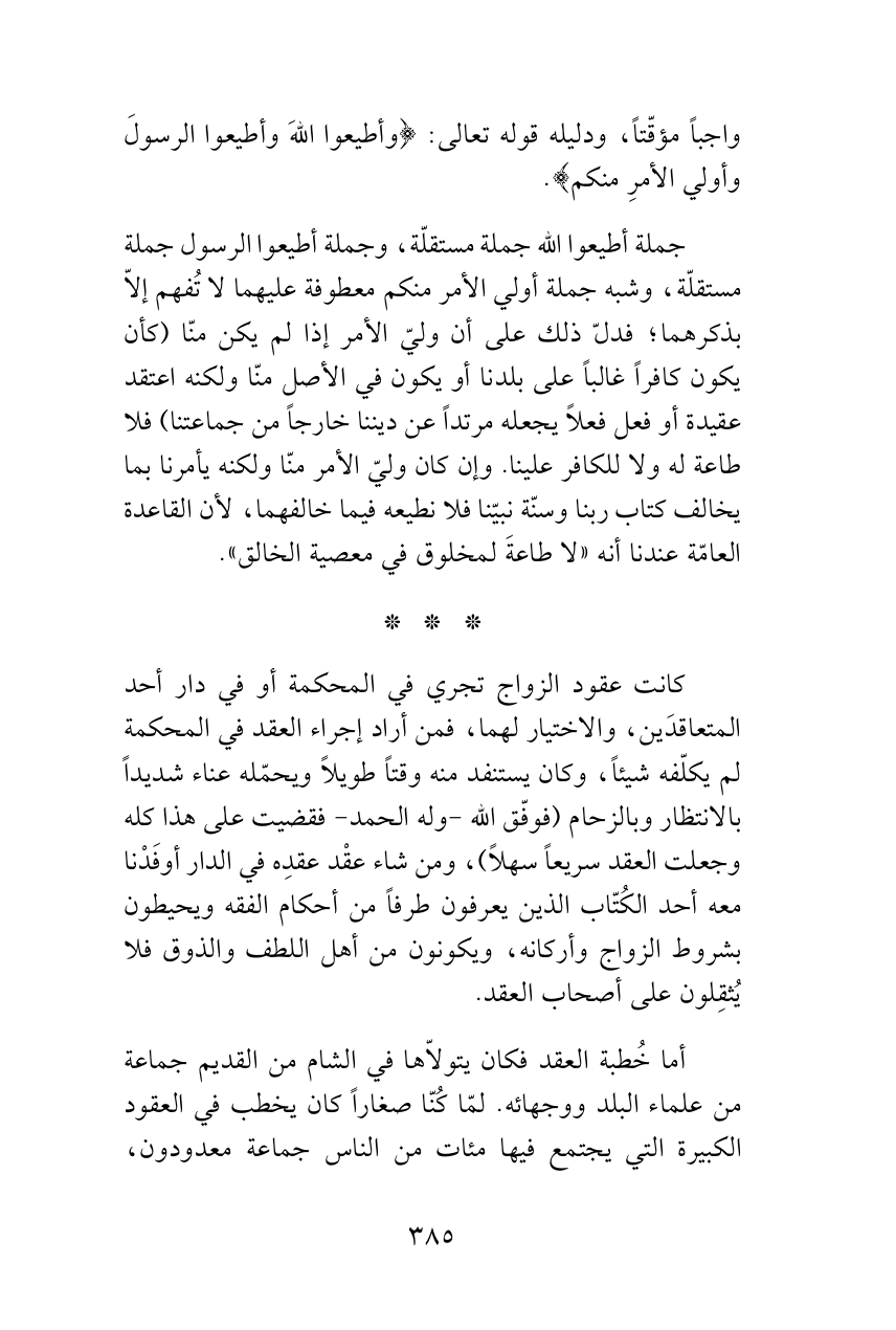 أما خُطبة العقد فكان يتولاّها في الشام من القديم جماعة من علماء البلد ووجهائه. لمّا كُنّا صغاراً كان يخطب في العقود الكبيرة التي يجتمع فيها مئات من الناس جماعة معدودون،