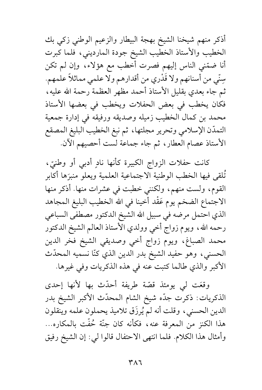 كانت حفلات الزواج الكبيرة كأنها نادٍ أدبي أو وطنيّ، تُلقى فيها الخطب الوطنية الاجتماعية العلمية ويعلو منبرَها أكابر القوم، ولست منهم، ولكنني خطبت في عشرات منها. أذكر منها الاجتماع الضخم يوم عَقْد أخينا في الله الخطيب البليغ المجاهد الذي احتمل مرضه في سبيل الله الشيخ الدكتور مصطفى السباعي رحمه الله، ويوم زواج أخي وولدي الأستاذ العالم الشيخ الدكتور محمد الصباغ، ويوم زواج أخي وصديقي الشيخ فخر الدين الحسني، وهو حفيد الشيخ بدر الدين الذي كنّا نسميه المحدّث الأكبر والذي طالما كتبت عنه في هذه الذكريات وفي غيرها.