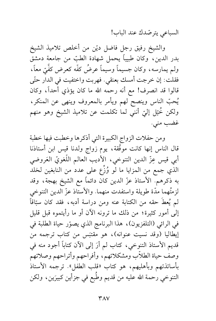 ومن حفلات الزواج الكبيرة التي أذكرها وخطبت فيها خطبة قال الناس إنها كانت موفَّقة، يوم زواج ولدنا قيس ابن أستاذنا أبي قيس عِزّ الدين التنوخي، الأديب العالم اللّغويّ العَروضي الذي جمع من المزايا ما لو وُزِّع على عدد من النابغين لخلد به ذكرهم. الأستاذ عزّ الدين كان دائماً مع الشيخ بهجة، وقد لزمتُهما مدّة طويلة واستفدت منهما. والأستاذ عزّ الدين التنوخي لم يُعطَ حقه من الكتابة عنه ومن دراسة أدبه، فقد كان سبّاقاً إلى أمور كثيرة؛ من ذلك ما ترونه الآن أو ما رأيتموه قبل قليل في الرائي (التلفزيون)، هذا البرنامج الذي يصوّر حياة الطلبة في إيطاليا (وقد نسيت عنوانه)، هو مقتبَس من كتاب ترجمه من قديم الأستاذ التنوخي، كتاب لم أرَ إلى الآن كتاباً أجود منه في وصف حياة الطلاّب ومشكلاتهم، وأفراحهم وأتراحهم وصلاتهم بأساتذتهم وبأهليهم، هو كتاب «قلب الطفل». ترجمه الأستاذ التنوخي رحمة الله عليه من قديم وطُبع في جزأين كبيرَين، ولكن