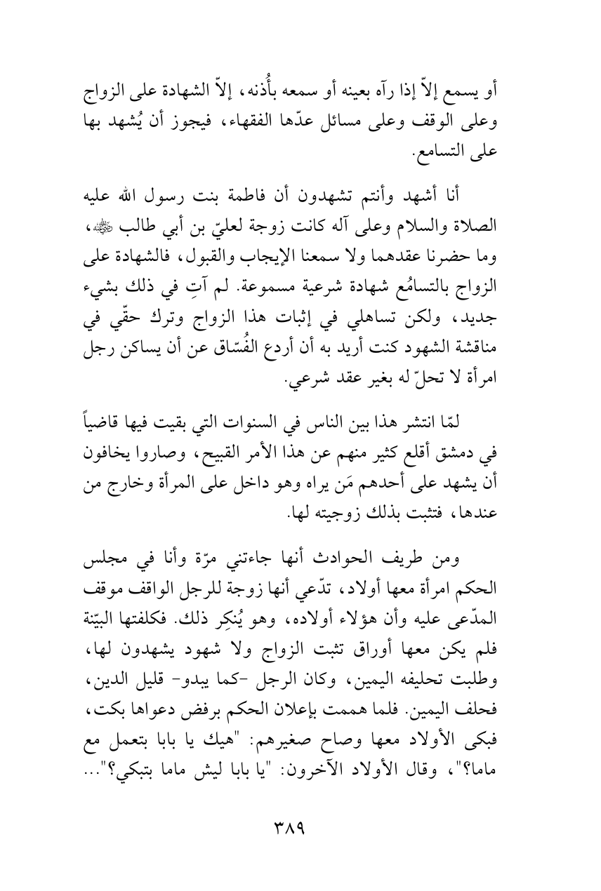 أنا أشهد وأنتم تشهدون أن فاطمة بنت رسول الله عليه الصلاة والسلام وعلى آله كانت زوجة لعليّ بن أبي طالب رضي الله عنه، وما حضرنا عقدهما ولا سمعنا الإيجاب والقبول، فالشهادة على الزواج بالتسامُع شهادة شرعية مسموعة. لم آتِ في ذلك بشيء جديد، ولكن تساهلي في إثبات هذا الزواج وترك حقّي في مناقشة الشهود كنت أريد به أن أردع الفُسّاق عن أن يساكن رجل امرأة لا تحلّ له بغير عقد شرعي.
