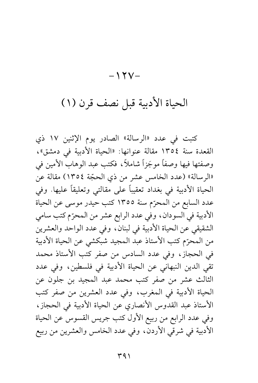 كتبت في عدد «الرسالة» الصادر يوم الإثنين 17 ذي القعدة سنة 1354 مقالة عنوانها: «الحياة الأدبية في دمشق»، وصفتها فيها وصفاً موجَزاً شاملاً، فكتب عبد الوهاب الأمين في «الرسالة» (عدد الخامس عشر من ذي الحجّة 1354) مقالة عن الحياة الأدبية في بغداد تعقيباً على مقالتي وتعليقاً عليها. وفي عدد السابع من المحرّم سنة 1355 كتب حيدر موسى عن الحياة الأدبية في السودان، وفي عدد الرابع عشر من المحرّم كتب سامي الشقيقي عن الحياة الأدبية في لبنان، وفي عدد الواحد والعشرين من المحرّم كتب الأستاذ عبد المجيد شبكشي عن الحياة الأدبية في الحجاز، وفي عدد السادس من صفر كتب الأستاذ محمد تقي الدين النبهاني عن الحياة الأدبية في فلسطين، وفي عدد الثالث عشر من صفر كتب محمد عبد المجيد بن جلون عن الحياة الأدبية في المغرب، وفي عدد العشرين من صفر كتب الأستاذ عبد القدوس الأنصاري عن الحياة الأدبية في الحجاز، وفي عدد الرابع من ربيع الأول كتب جريس القسوس عن الحياة الأدبية في شرقي الأردن، وفي عدد الخامس والعشرين من ربيع