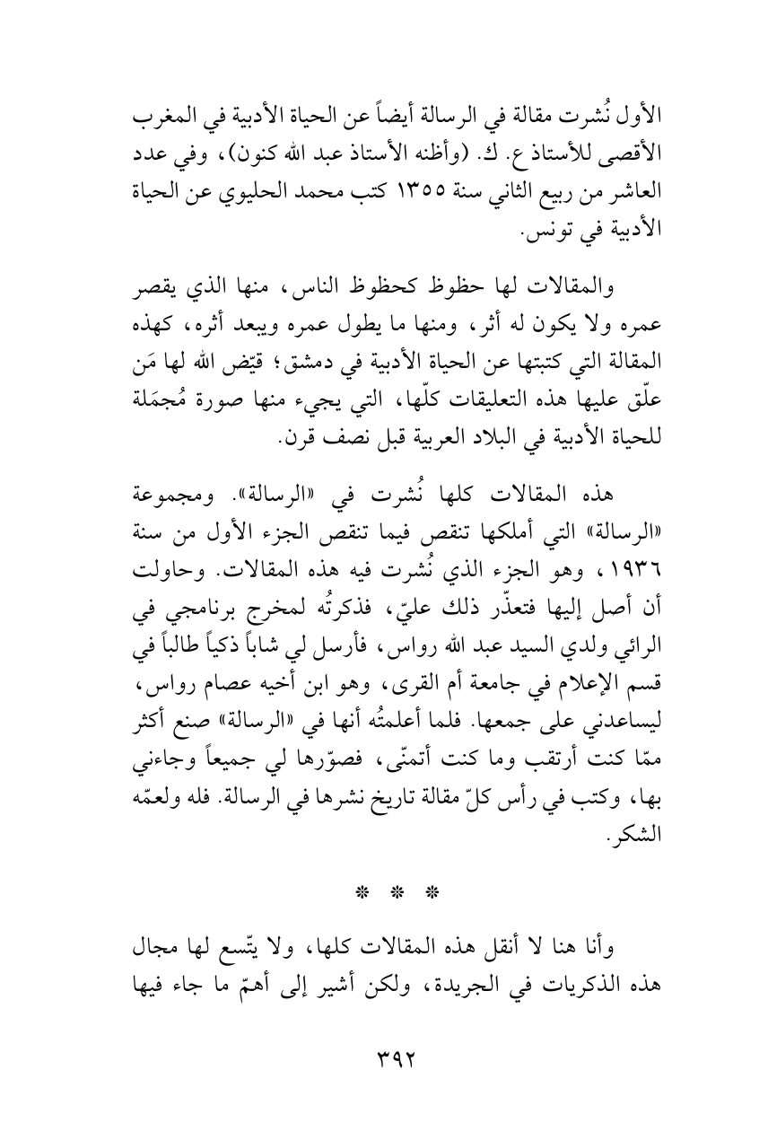 الأول نُشرت مقالة في الرسالة أيضاً عن الحياة الأدبية في المغرب الأقصى للأستاذ ع. ك. (وأظنه الأستاذ عبد الله كنون)، وفي عدد العاشر من ربيع الثاني سنة 1355 كتب محمد الحليوي عن الحياة الأدبية في تونس.