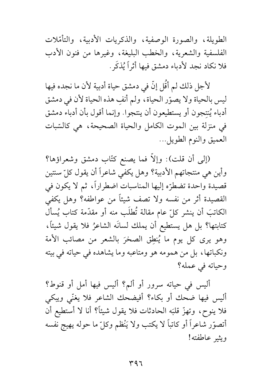 لأجل ذلك لم أقُل إنّ في دمشق حياة أدبية لأن ما نجده فيها ليس بالحياة ولا يصوّر الحياة، ولم أنفِ هذه الحياة لأن في دمشق أدباء يُنتِجون أو يستطيعون أن ينتجوا. وإنما أقول بأن أدباء دمشق في منزلة بين الموت الكامل والحياة الصحيحة، هي كالسّبات العميق والنوم الطويل ...
