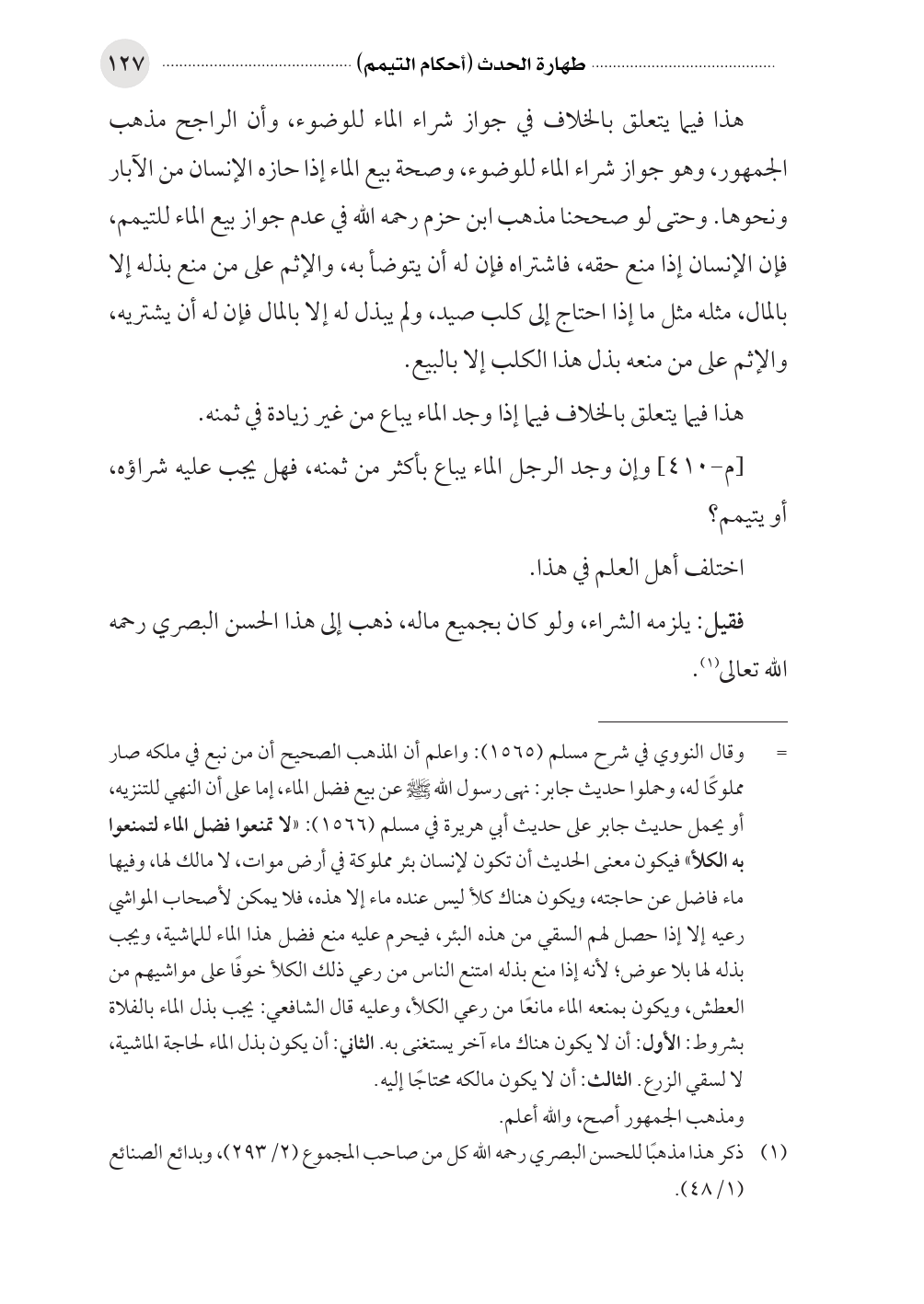 هذا فيما يتعلق بالخلاف في جواز شراء الماء للوضوء، وأن الراجح مذهب الجمهور، وهو جواز شراء الماء للوضوء، وصحة بيع الماء إذا حازه الإنسان من الآبار ونحوها. وحتى لو صححنا مذهب ابن حزم رحمه الله في عدم جواز بيع الماء للتيمم، فإن الإنسان إذا منع حقه، فاشتراه فإن له أن يتوضأ به، والإثم على من منع بذله إلا بالمال، مثله مثل ما إذا احتاج إلى كلب صيد، ولم يبذل له إلا بالمال فإن له أن يشتريه، والإثم على من منعه بذل هذا الكلب إلا بالبيع.