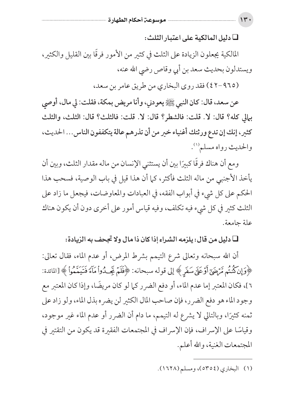 المالكية يجعلون الزيادة على الثلث في كثير من الأمور فرقًا بين القليل والكثير، ويستدلون بحديث سعد بن أبي وقاص رضي الله عنه، (٩٦٥ - ٤٢) فقد روى البخاري من طريق عامر بن سعد، عن سعد، قال: كان النبي صلى الله عليه وسلم يعودني، وأنا مريض بمكة، فقلت: لي مال، أوصي بمالي كله؟ قال: لا. قلت: فالشطر؟ قال: لا. قلت: فالثلث؟ قال: الثلث، والثلث كثير، إنك إن تدع ورثتك أغنياء خير من أن تذرهم عالة يتكففون الناس ... الحديث، والحديث رواه مسلم (¬١).