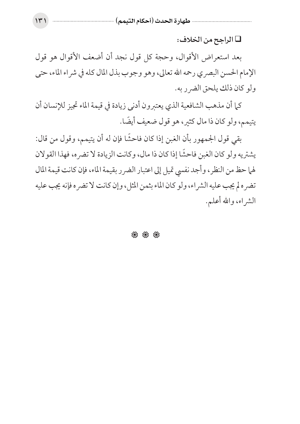 بقي قول الجمهور بأن الغبن إذا كان فاحشًا فإن له أن يتيمم، وقول من قال: يشتريه ولو كان الغبن فاحشًا إذا كان ذا مال، وكانت الزيادة لا تضره، فهذا القولان لهما حظ من النظر، وأجد نفسي تميل إلى اعتبار الضرر بقيمة الماء، فإن كانت قيمة المال تضره لم يجب عليه الشراء، ولو كان الماء بثمن المثل، وإن كانت لا تضره فإنه يجب عليه الشراء، والله أعلم.