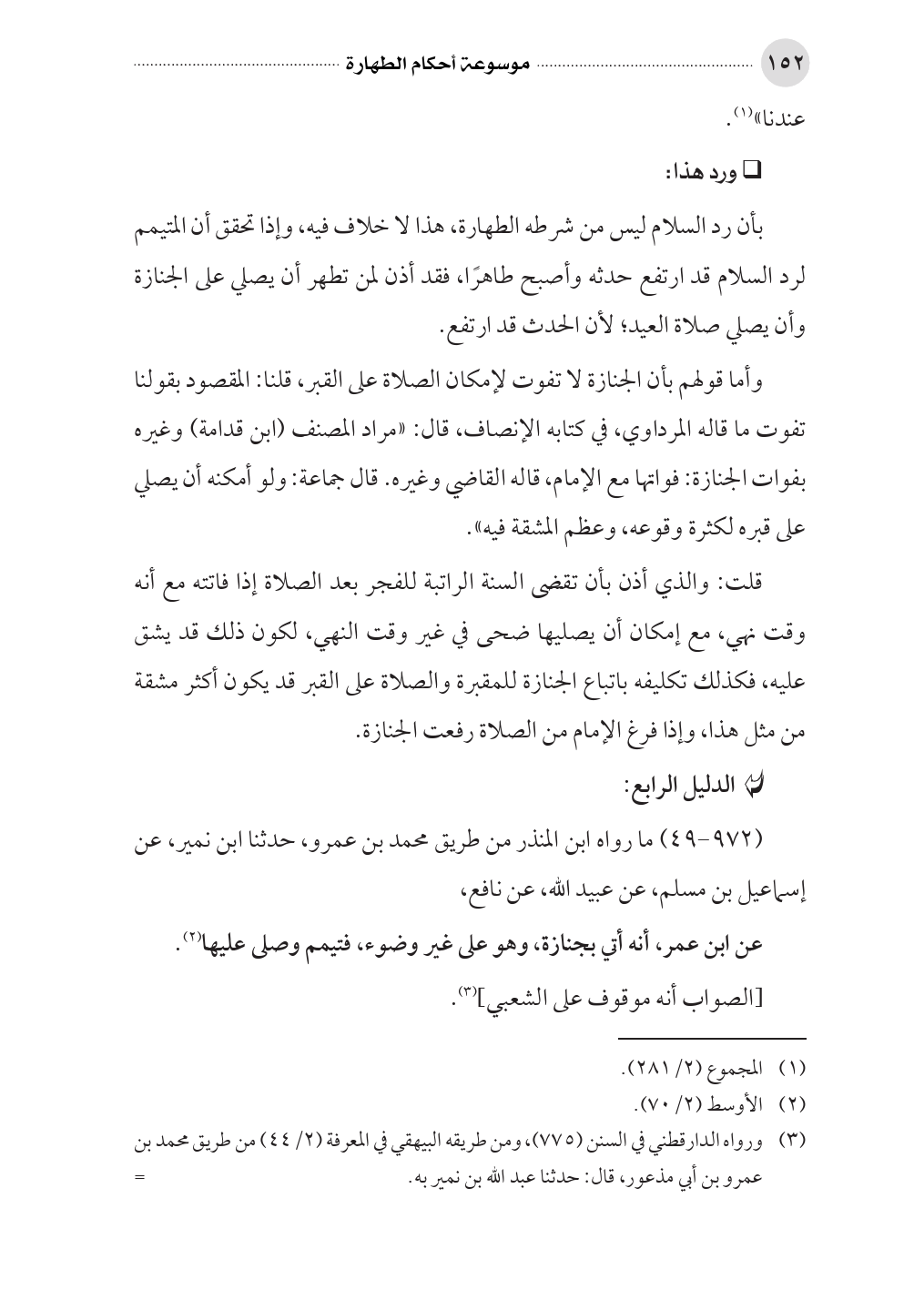 (٩٧٢ - ٤٩) ما رواه ابن المنذر من طريق محمد بن عمرو، حدثنا ابن نمير، عن إسماعيل بن مسلم، عن عبيد الله، عن نافع، عن ابن عمر، أنه أتي بجنازة، وهو على غير وضوء، فتيمم وصلى عليها (¬٢).