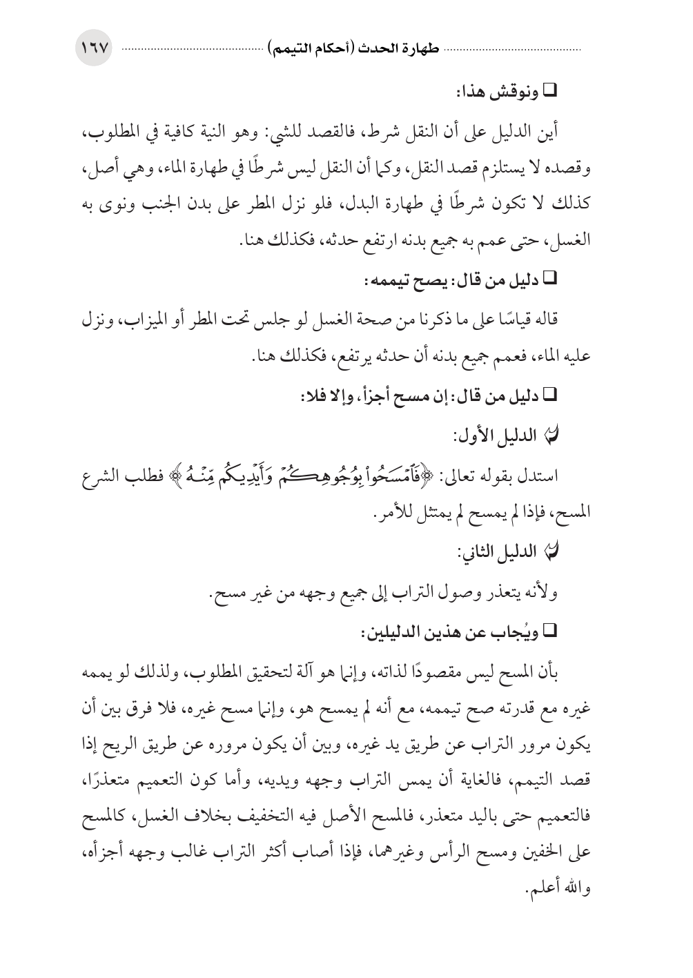 أين الدليل على أن النقل شرط، فالقصد للشي: وهو النية كافية في المطلوب، وقصده لا يستلزم قصد النقل، وكما أن النقل ليس شرطًا في طهارة الماء، وهي أصل، كذلك لا تكون شرطًا في طهارة البدل، فلو نزل المطر على بدن الجنب ونوى به الغسل، حتى عمم به جميع بدنه ارتفع حدثه، فكذلك هنا.