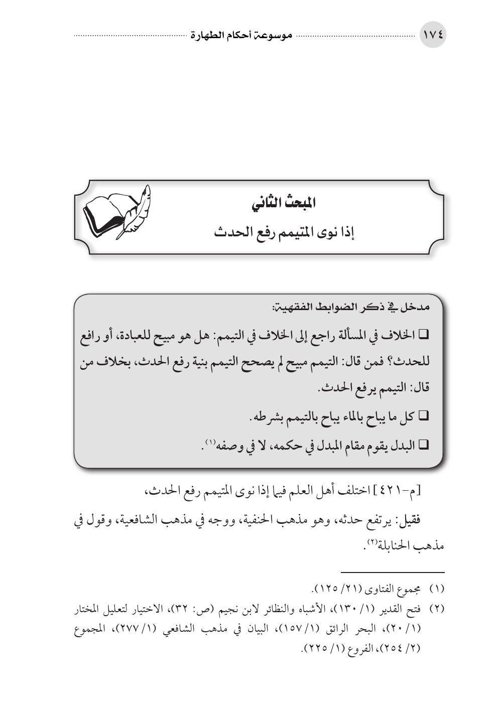 (¬٢) فتح القدير (١/ ١٣٠)، الأشباه والنظائر لابن نجيم (ص: ٣٢)، الاختيار لتعليل المختار (١/ ٢٠)، البحر الرائق (١/ ١٥٧)، البيان في مذهب الشافعي (١/ ٢٧٧)، المجموع (٢/ ٢٥٤)، الفروع (١/ ٢٢٥).