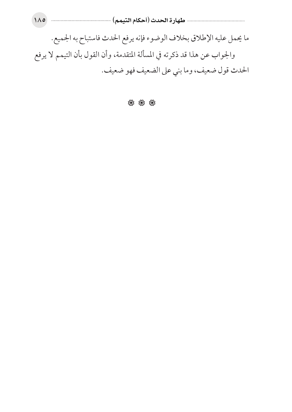 والجواب عن هذا قد ذكرته في المسألة المتقدمة، وأن القول بأن التيمم لا يرفع الحدث قول ضعيف، وما بني على الضعيف فهو ضعيف.
