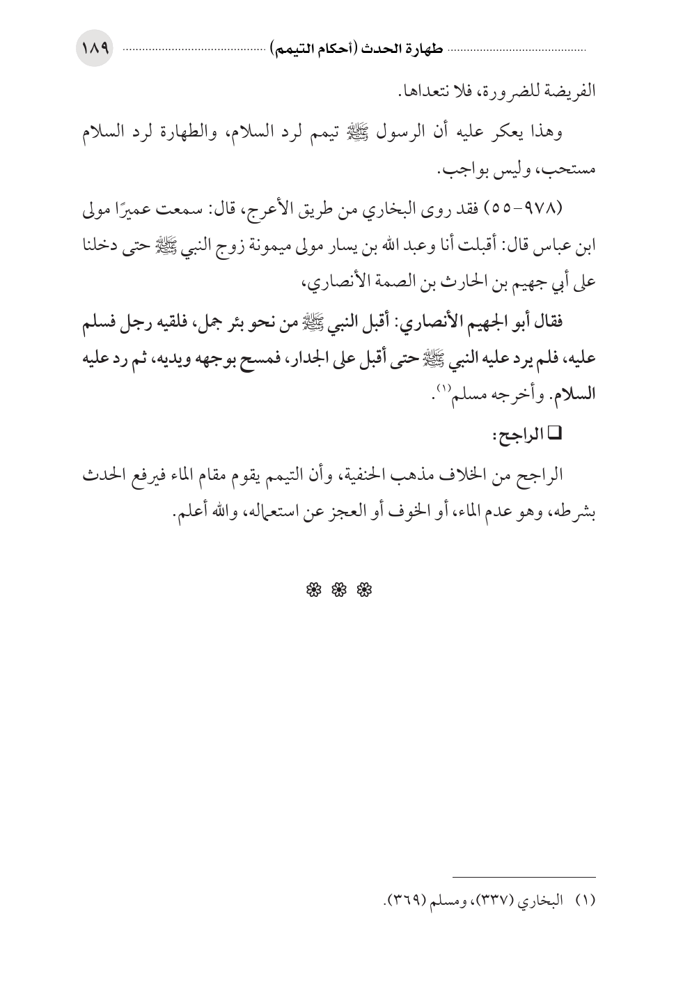 فقال أبو الجهيم الأنصاري: أقبل النبي صلى الله عليه وسلم من نحو بئر جمل، فلقيه رجل فسلم عليه، فلم يرد عليه النبي صلى الله عليه وسلم حتى أقبل على الجدار، فمسح بوجهه ويديه، ثم رد عليه السلام. وأخرجه مسلم (¬١).
