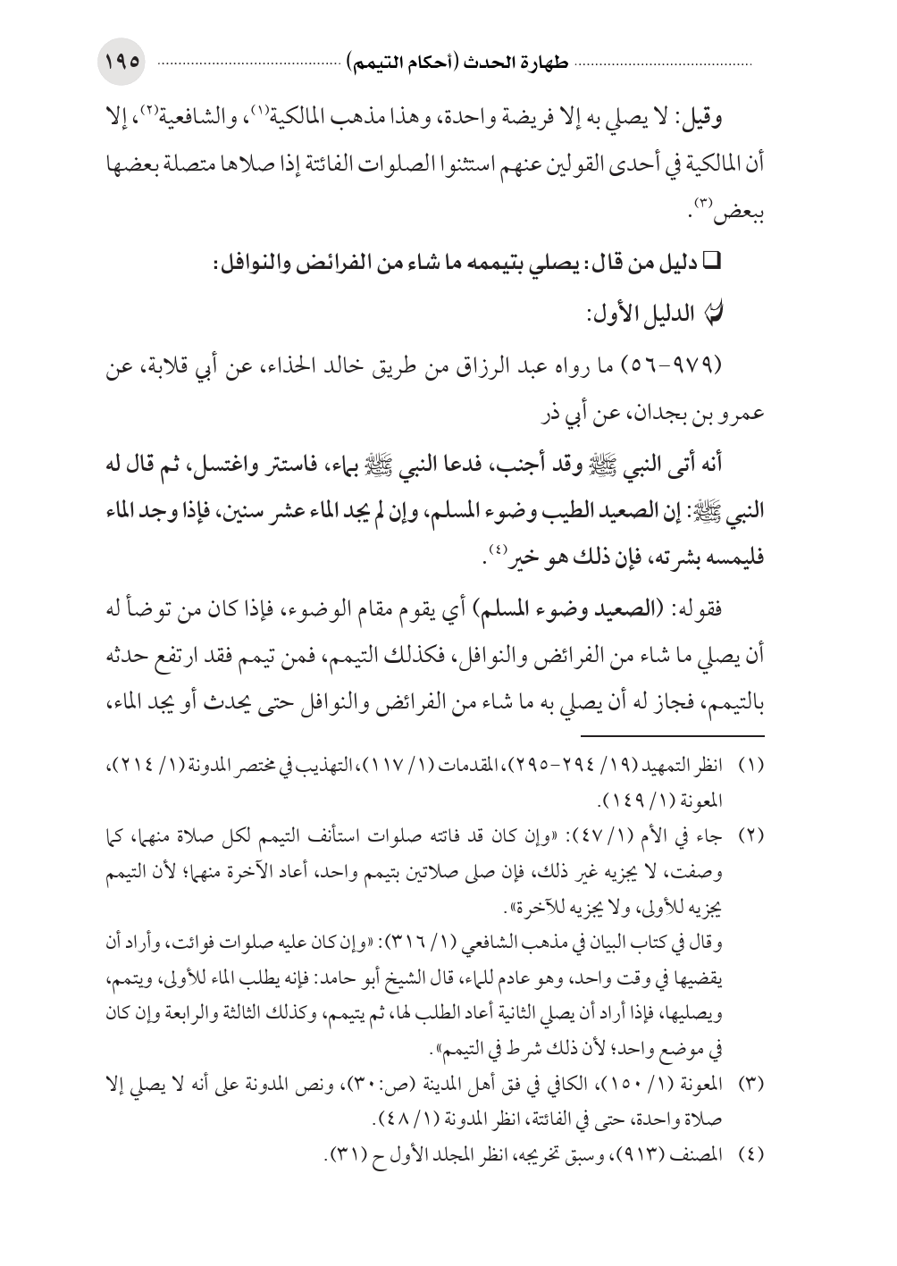 (¬٣) المعونة (١/ ١٥٠)، الكافي في فق أهل المدينة (ص: ٣٠)، ونص المدونة على أنه لا يصلي إلا صلاة واحدة، حتى في الفائتة، انظر المدونة (١/ ٤٨).